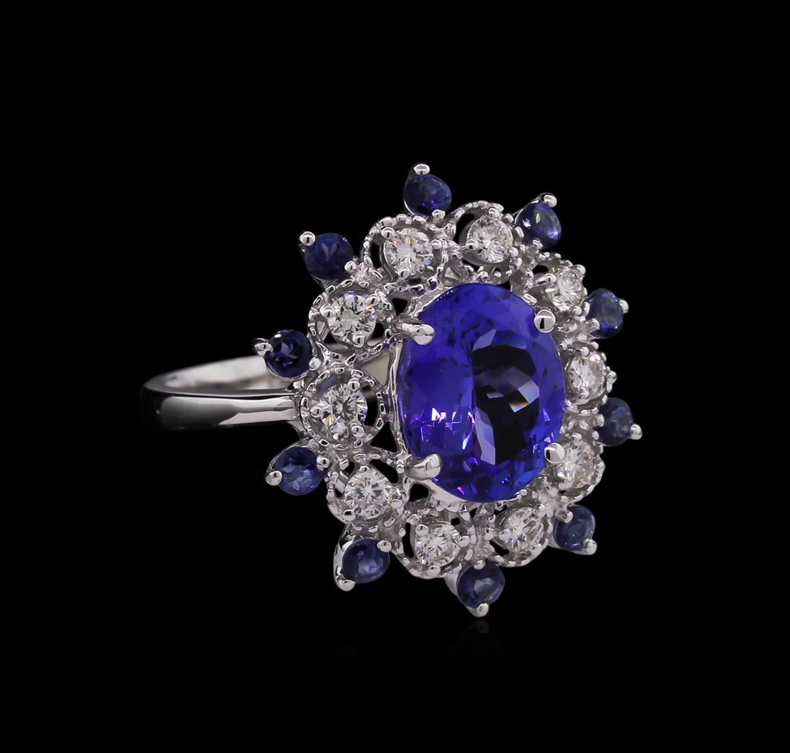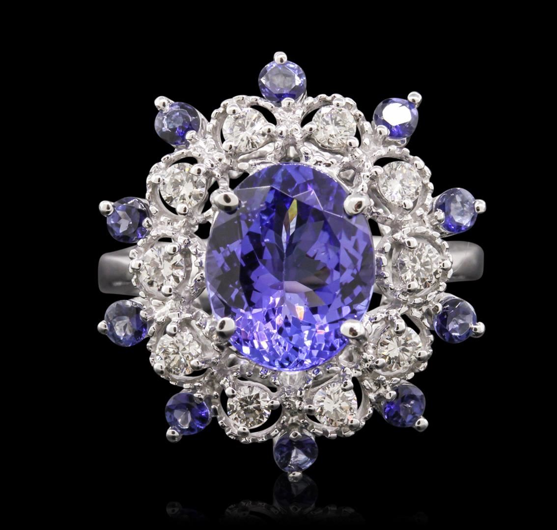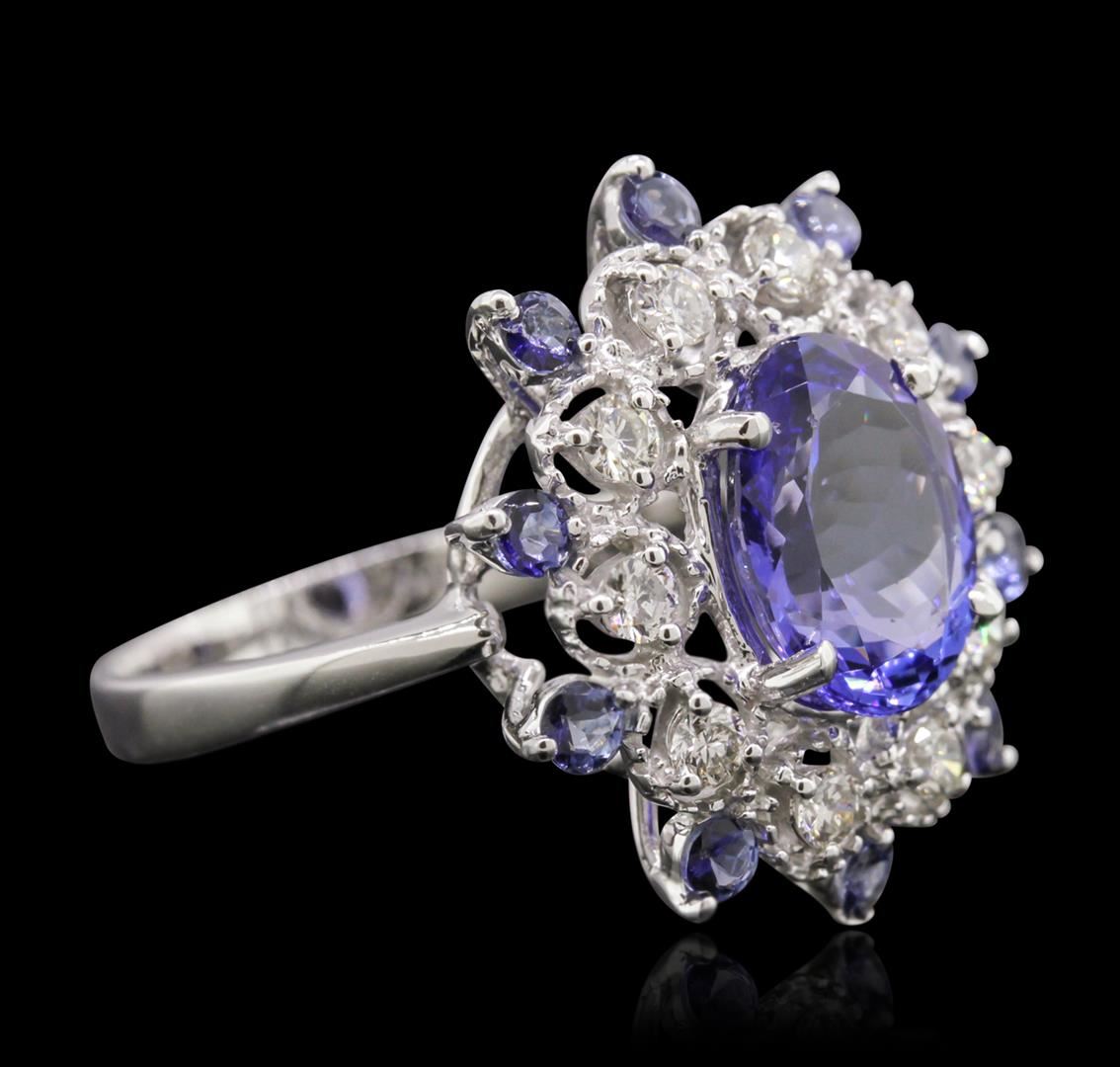 One electronically tested 14KT white gold Ladies combination cast & assembled ring with a bright polish finish. Condition is new. Identified with markings of "14K". Containing: One prong set oval modified brilliant cut natural tanzanite, measuring 10.40 x 8.50 x 4.90mm, approximate weight of 2.93ct., clarity is eye clean, type I, medium light, very slightly grayish, bluish violet color, (GIA bV 4/3), cut is good. Ten prong set round modified brilliant cut natural tanzanites, measuring 2.20 - 2.20 x 1.43 mm, approximate. Total Weight of 0.50ct., clarity is eye clean, type I, medium light, very slightly grayish, bluish violet color, (GIA bV 4/3), cut is very good. Colored gemstones are presumed to have been subjected to commonly used color/clarity enhancement processes. Ten prong set round brilliant cut diamonds, measuring 2.20 - 2.20 x 1.32mm (depth est.) approximate. Total Weight of 10 Stones = 0.39ct. Clarity: SI-2 to I-1. Color: H - I, Cut is Good. All grading of diamonds and colored gemstones in this piece of jewelry are graded in the mounting, unless otherwise stated. Total Weight of Colored Stones 3.43ct. Total Weight of Diamonds 0.39ct. Total Weight of Ring 5.50 grams. GGL Appraised at $7,450.00.