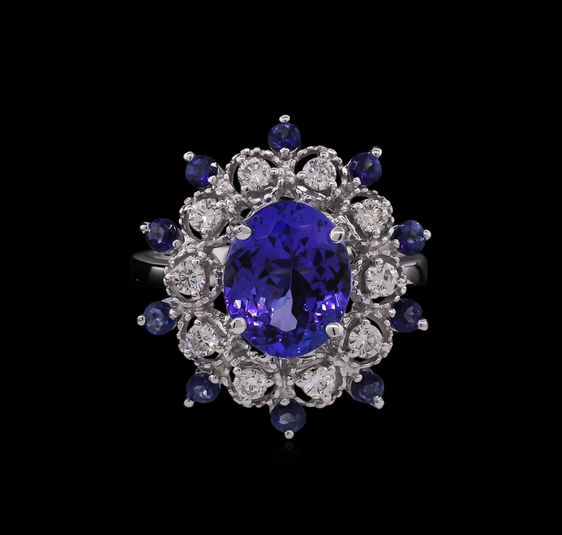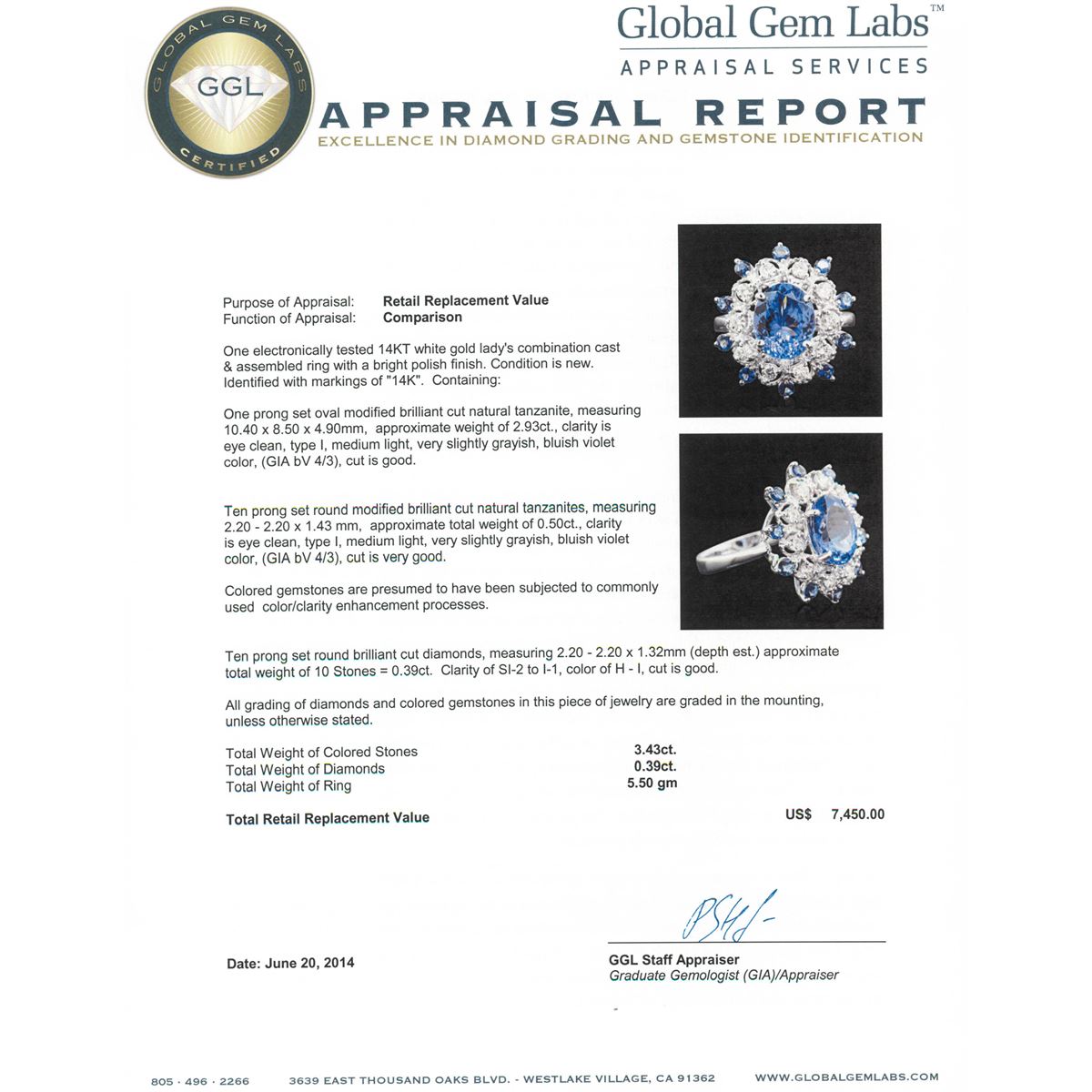 One electronically tested 14KT white gold Ladies combination cast & assembled ring with a bright polish finish. Condition is new. Identified with markings of "14K". Containing: One prong set oval modified brilliant cut natural tanzanite, measuring 10.40 x 8.50 x 4.90mm, approximate weight of 2.93ct., clarity is eye clean, type I, medium light, very slightly grayish, bluish violet color, (GIA bV 4/3), cut is good. Ten prong set round modified brilliant cut natural tanzanites, measuring 2.20 - 2.20 x 1.43 mm, approximate. Total Weight of 0.50ct., clarity is eye clean, type I, medium light, very slightly grayish, bluish violet color, (GIA bV 4/3), cut is very good. Colored gemstones are presumed to have been subjected to commonly used color/clarity enhancement processes. Ten prong set round brilliant cut diamonds, measuring 2.20 - 2.20 x 1.32mm (depth est.) approximate. Total Weight of 10 Stones = 0.39ct. Clarity: SI-2 to I-1. Color: H - I, Cut is Good. All grading of diamonds and colored gemstones in this piece of jewelry are graded in the mounting, unless otherwise stated. Total Weight of Colored Stones 3.43ct. Total Weight of Diamonds 0.39ct. Total Weight of Ring 5.50 grams. GGL Appraised at $7,450.00.