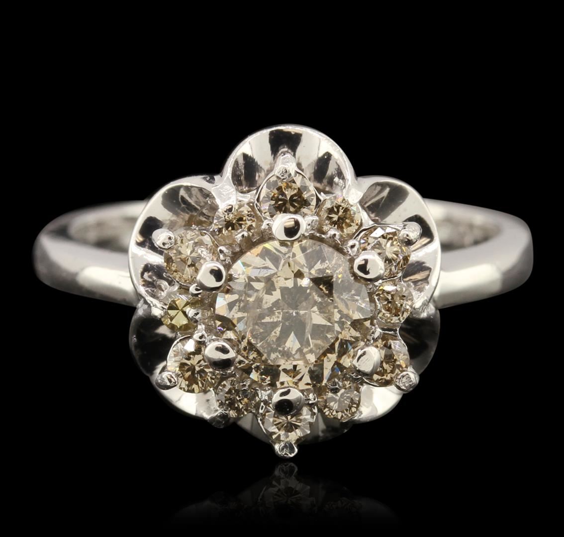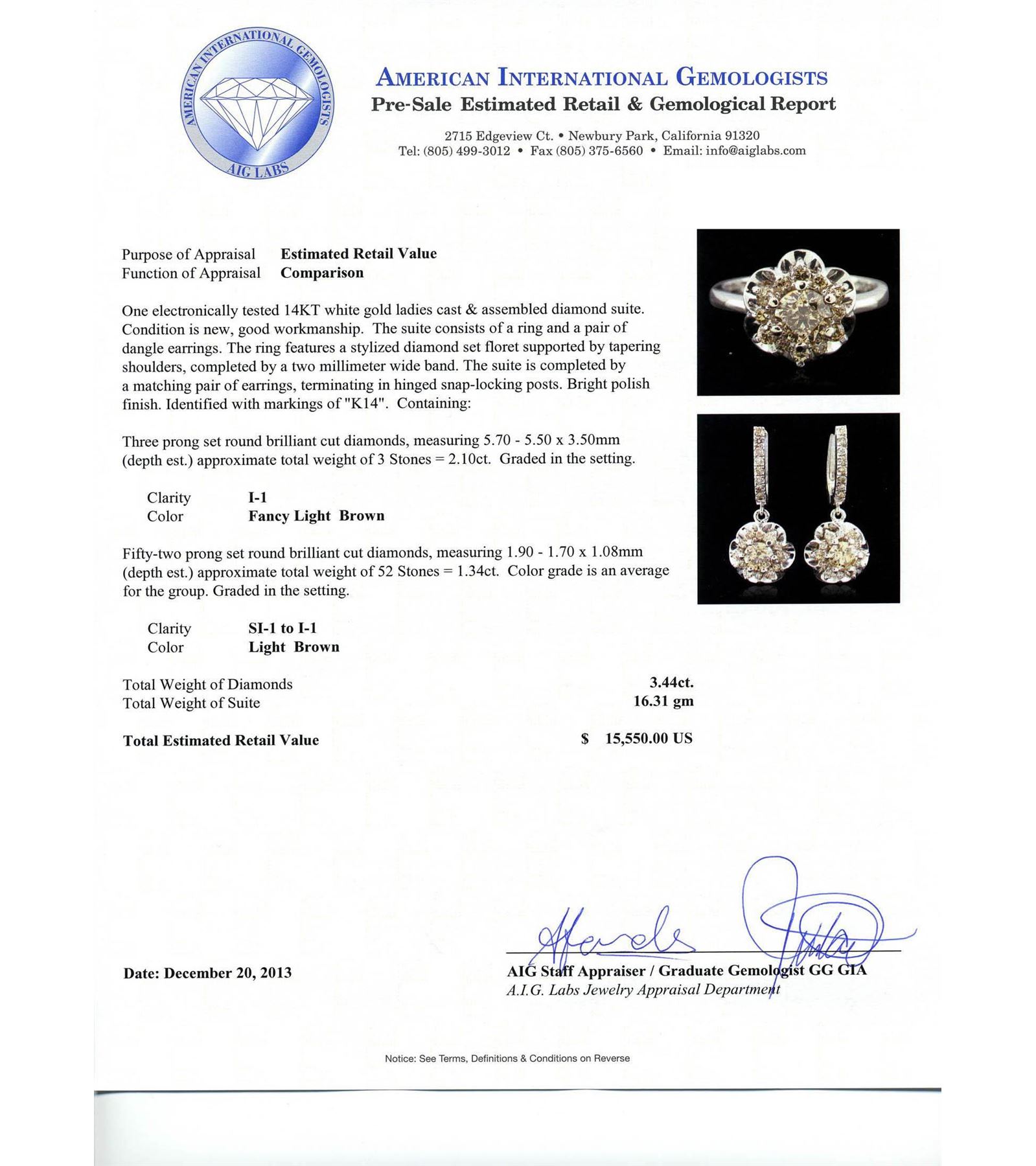 14KT white gold 3.44ctw Diamond Jewelry Suite. One electronically tested 14KT white gold ladies cast & assembled diamond suite. The suite consists of a ring and a pair of dangle earrings. The ring features a stylized diamond set floret supported by tapering shoulders, completed by a two millimeter wide band. The suite is completed by a matching pair of earrings, terminating in hinged snap-locking posts. Bright polish finish. Identified with markings of "K14". Condition is new, good workmanship. Containing: Three prong set round brilliant cut diamonds, measuring 5.70 - 5.50 x 3.50mm (depth est.) approximate. Total Weight of 3 Stones = 2.10ct. Graded in the setting. Clarity: I-1 Fifty-Two prong set round brilliant cut diamonds, measuring 1.90 - 1.70 x 1.08mm (depth est.) approximate. Total Weight of 52 Stones = 1.34ct. Color grade is an average for the group. Graded in the setting. Clarity: SI-1 to I-1. Total Weight of Diamonds 3.44ct. AIG Appraised at $15,550.00.