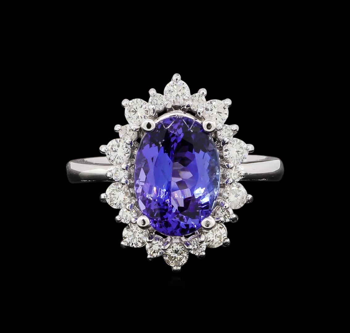 One electronically tested 14KT white gold ladies cast tanzanite and diamond ring with a bright polish finish. Identified with markings of "14K". Condition is new. Containing: One prong set oval modified brilliant cut natural tanzanite, measuring 11.10 x 8.00 x 5.50mm, approximate weight of 3.44ct., clarity is eye clean, type I, medium light, very slightly grayish, violet color, (GIA V 4/3), cut is good. Ten prong set round brilliant cut diamonds, measuring 2.50 - 2.50 x 1.50mm (depth est.) approximate total weight of 10 Stones = 0.57ct. Clarity: SI-1 to SI-2. Color: H - I, Cut is Good. Ten prong set round brilliant cut diamonds, measuring 1.50 - 1.50 x 0.90mm (depth est.) approximate total weight of 10 Stones = 0.12ct. Clarity: SI-1 to SI-2. Color: H - I, Cut is Good. Colored gemstones are presumed to have been subjected to commonly used enhancement processes. All diamonds and colored gemstones are graded in the mounting, unless otherwise stated. Total Weight of Colored Stones 3.44ct. Total Weight of Diamonds 0.69ct. Total Weight of Ring 5.90 grams. GGL Appraised at $4,465.00.