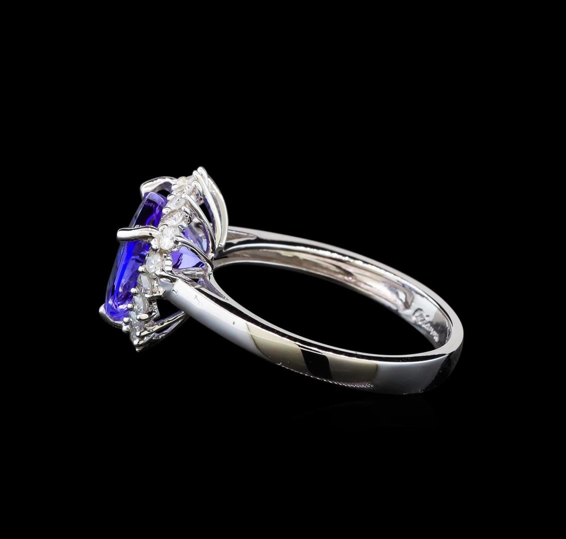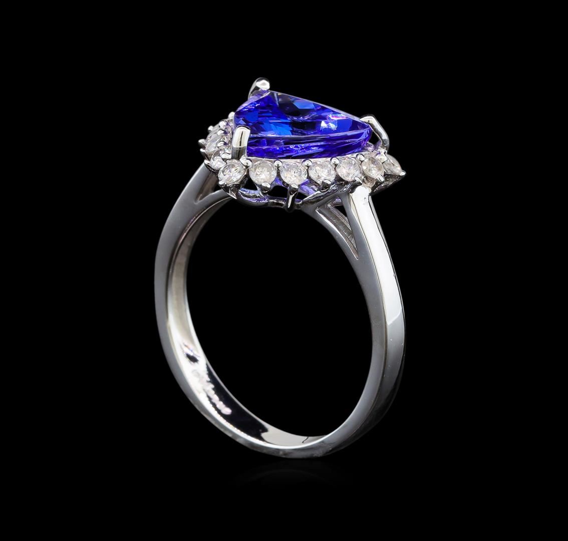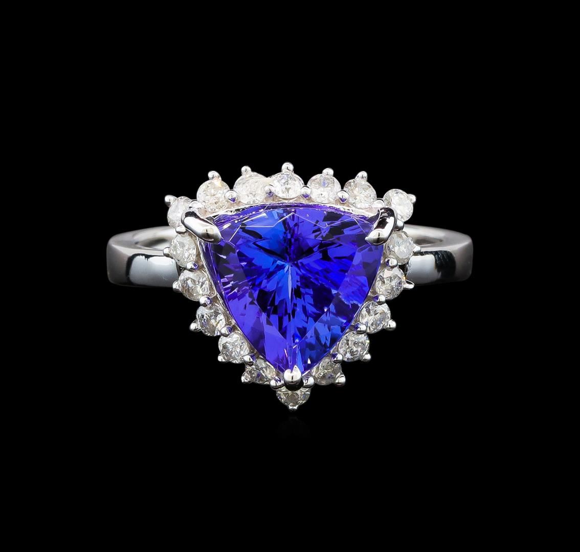 One electronically tested 14KT white gold ladies cast tanzanite and diamond ring with a bright polish finish. Identified with markings of "14K". Condition is new. Containing: One prong set triangle modified brilliant cut natural tanzanite, measuring 10.00 x 10.00 x 5.70mm, approximate weight of 3.44ct., clarity is eye clean, type I, medium light, moderately strong, violet color, (GIA V 4/4), cut is good. Eighteen prong set round brilliant cut diamonds, measuring 1.80 - 1.80 x 1.08mm (depth est.) approximate total weight of 18 Stones = 0.38ct. Clarity: SI-2 to I-2. Color: I - J. Colored gemstones are presumed to have been subjected to commonly used enhancement processes. All diamonds and colored gemstones are graded in the mounting, unless otherwise stated. Total Weight of Colored Stones 3.44ct. Total Weight of Diamonds 0.38ct. Total Weight of Ring 3.60 grams. GGL Appraised at $3,670.00.
