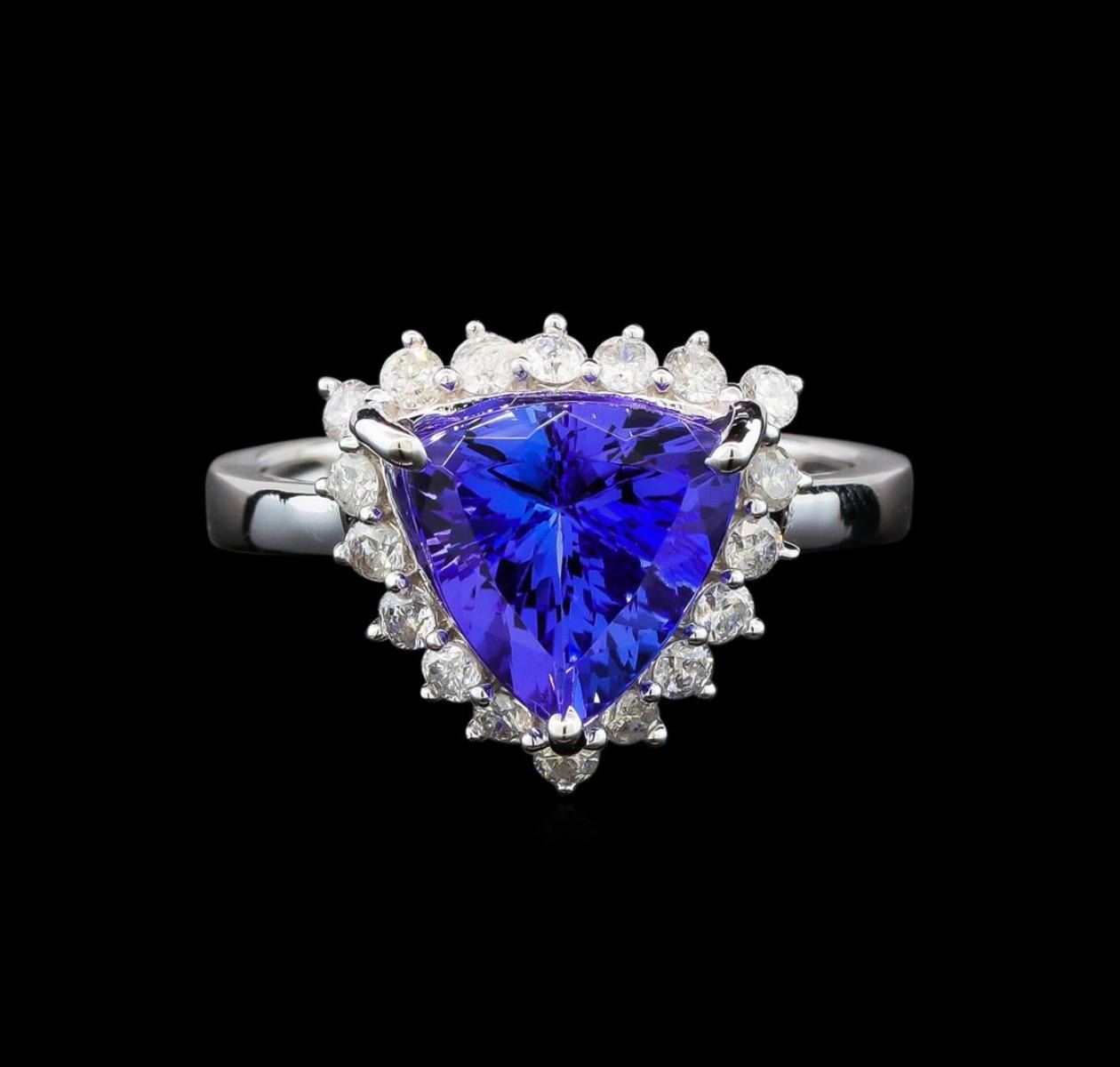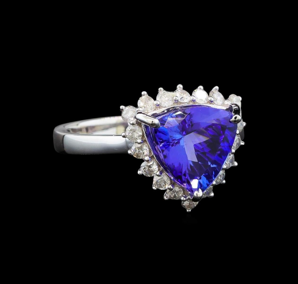 One electronically tested 14KT white gold ladies cast tanzanite and diamond ring with a bright polish finish. Identified with markings of "14K". Condition is new. Containing: One prong set triangle modified brilliant cut natural tanzanite, measuring 10.00 x 10.00 x 5.70mm, approximate weight of 3.44ct., clarity is eye clean, type I, medium light, moderately strong, violet color, (GIA V 4/4), cut is good. Eighteen prong set round brilliant cut diamonds, measuring 1.80 - 1.80 x 1.08mm (depth est.) approximate total weight of 18 Stones = 0.38ct. Clarity: SI-2 to I-2. Color: I - J. Colored gemstones are presumed to have been subjected to commonly used enhancement processes. All diamonds and colored gemstones are graded in the mounting, unless otherwise stated. Total Weight of Colored Stones 3.44ct. Total Weight of Diamonds 0.38ct. Total Weight of Ring 3.60 grams. GGL Appraised.