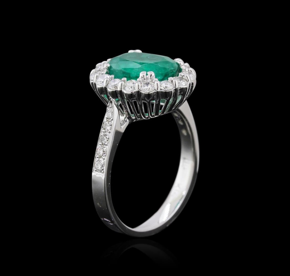 One electronically tested 14KT white gold ladies cast emerald and diamond ring with a flat shank with a bright polish finish. Identified with markings of "K14". Condition is new. Containing: One prong set emerald modified step cut natural emerald, measuring 11.01 x 7.65 x 5.57mm, approximate weight of 3.45ct., clarity is heavily included, type III, medium light, very slightly grayish, very slightly bluish green color, (GIA vslbG 4/3), cut is good. Seventy-Two prong set round brilliant cut diamonds, measuring 1.90 - 1.50 x 1.02mm (depth est.) approximate total weight of 72 Stones = 0.56ct. Clarity: SI-1 to I-1. Color: H - I, Cut is Good. Diamonds and colored gemstones are graded in the mounting, unless otherwise stated. Colored gemstones are presumed to have been subjected to commonly used enhancement processes. Total Weight of Colored Stones 3.45ct. Total Weight of Diamonds 0.56ct. Total Weight of Ring 5.30 grams. GGL Appraised at $4,870.00.