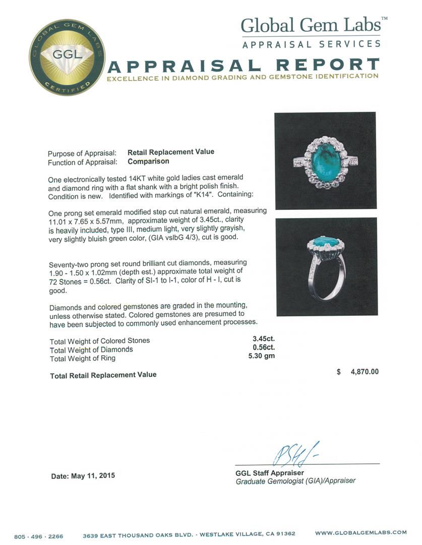 One electronically tested 14KT white gold ladies cast emerald and diamond ring with a flat shank with a bright polish finish. Identified with markings of "K14". Condition is new. Containing: One prong set emerald modified step cut natural emerald, measuring 11.01 x 7.65 x 5.57mm, approximate weight of 3.45ct., clarity is heavily included, type III, medium light, very slightly grayish, very slightly bluish green color, (GIA vslbG 4/3), cut is good. Seventy-Two prong set round brilliant cut diamonds, measuring 1.90 - 1.50 x 1.02mm (depth est.) approximate total weight of 72 Stones = 0.56ct. Clarity: SI-1 to I-1. Color: H - I, Cut is Good. Diamonds and colored gemstones are graded in the mounting, unless otherwise stated. Colored gemstones are presumed to have been subjected to commonly used enhancement processes. Total Weight of Colored Stones 3.45ct. Total Weight of Diamonds 0.56ct. Total Weight of Ring 5.30 grams. GGL Appraised at $4,870.00.