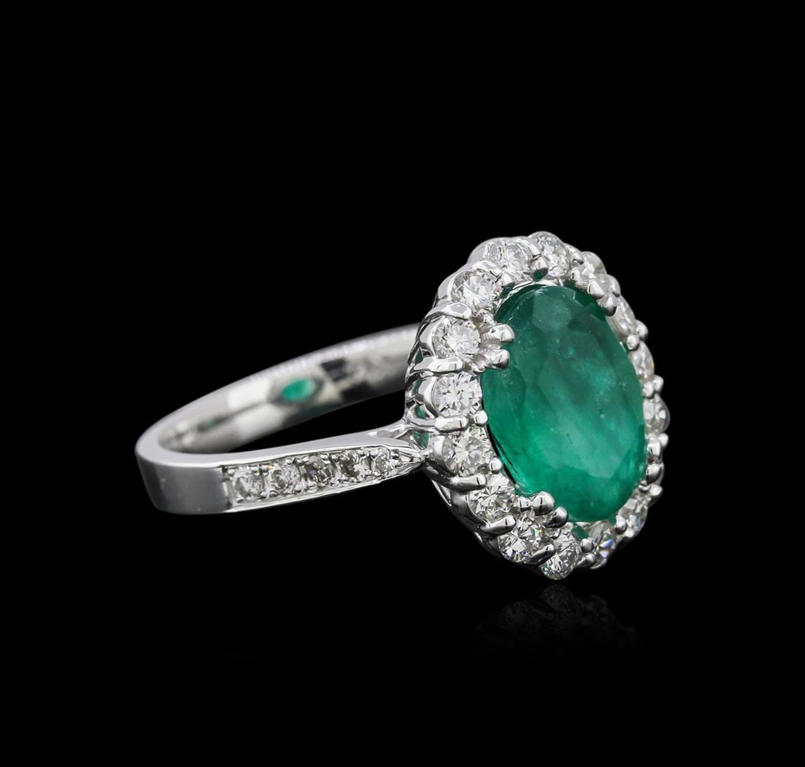 One electronically tested 14KT white gold ladies cast emerald and diamond ring with a flat shank with a bright polish finish. Identified with markings of "K14". Condition is new. Containing: One prong set emerald modified step cut natural emerald, measuri GGL Appraised at $4,870.00.
