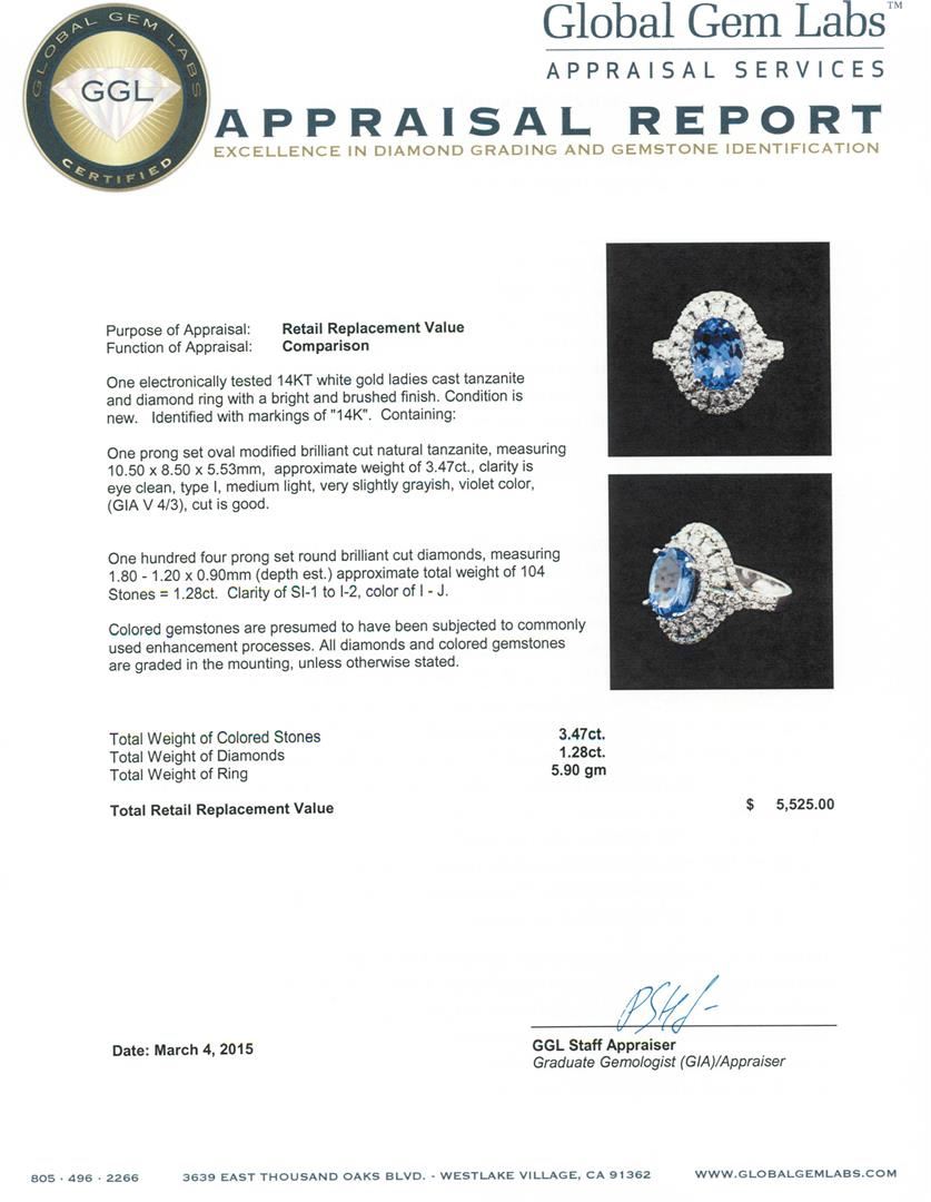 One electronically tested 14KT white gold ladies cast tanzanite and diamond ring with a bright and brushed finish. Identified with markings of "14K". Condition is new. Containing: One prong set oval modified brilliant cut natural tanzanite, measuring 10.50 x 8.50 x 5.53mm, approximate weight of 3.47ct., clarity is eye clean, type I, medium light, very slightly grayish, violet color, (GIA V 4/3), cut is good. One Hundred Four prong set round brilliant cut diamonds, measuring 1.80 - 1.20 x 0.90mm (depth est.) approximate total weight of 104 Stones = 1.28ct. Clarity: SI-1 to I-2. Color: I - J. Colored gemstones are presumed to have been subjected to commonly used enhancement processes. All diamonds and colored gemstones are graded in the mounting, unless otherwise stated. Total Weight of Colored Stones 3.47ct. Total Weight of Diamonds 1.28ct. Total Weight of Ring 5.90 grams. GGL Appraised at $5,525.00.