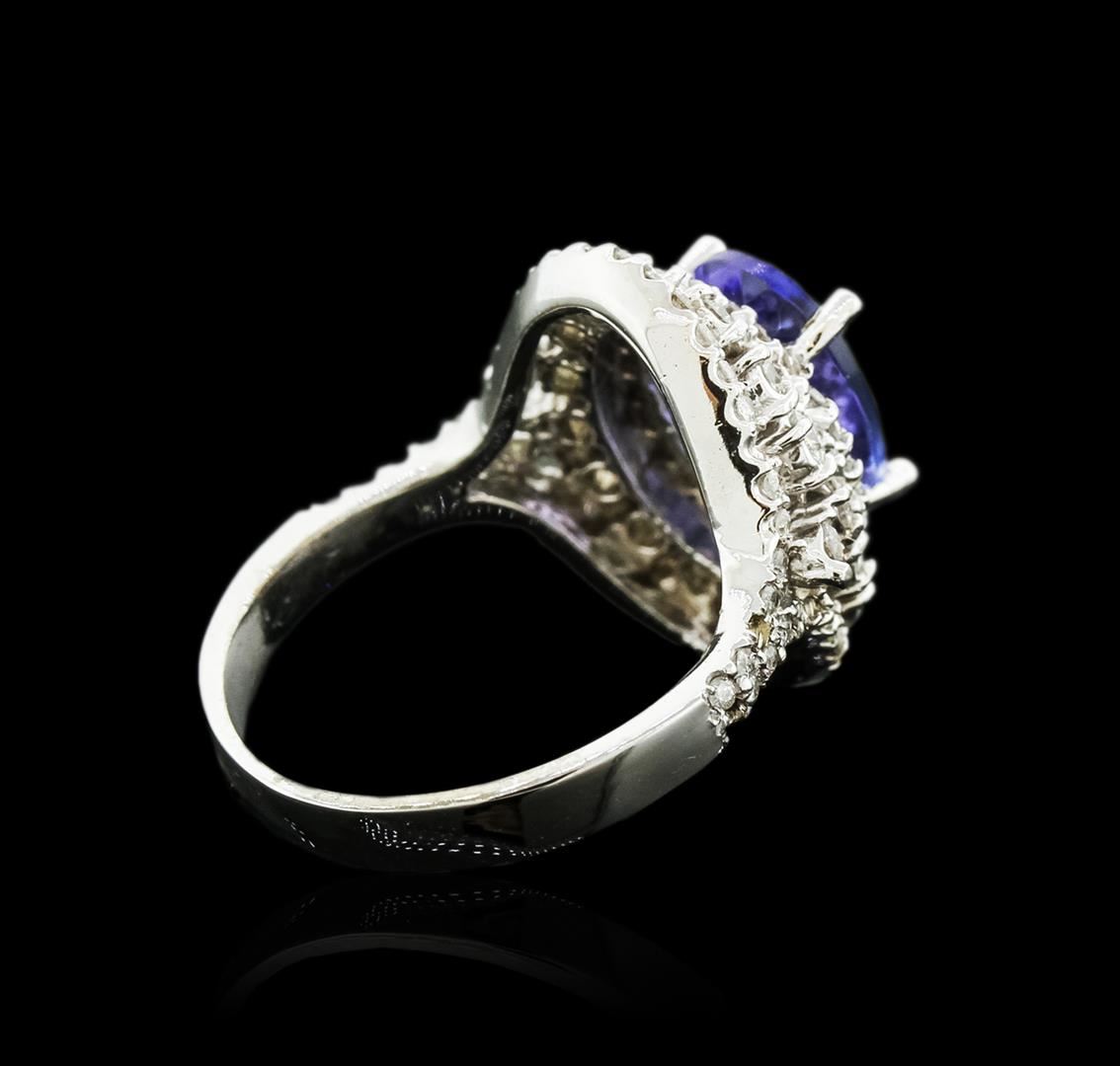 One electronically tested 14KT white gold ladies cast tanzanite and diamond ring with a bright and brushed finish. Identified with markings of "14K". Condition is new. Containing: One prong set oval modified brilliant cut natural tanzanite, measuring 10.50 x 8.50 x 5.53mm, approximate weight of 3.47ct., clarity is eye clean, type I, medium light, very slightly grayish, violet color, (GIA V 4/3), cut is good. One Hundred Four prong set round brilliant cut diamonds, measuring 1.80 - 1.20 x 0.90mm (depth est.) approximate total weight of 104 Stones = 1.28ct. Clarity: SI-1 to I-2. Color: I - J. Colored gemstones are presumed to have been subjected to commonly used enhancement processes. All diamonds and colored gemstones are graded in the mounting, unless otherwise stated. Total Weight of Colored Stones 3.47ct. Total Weight of Diamonds 1.28ct. Total Weight of Ring 5.90 grams. GGL Appraised at $5,525.00.