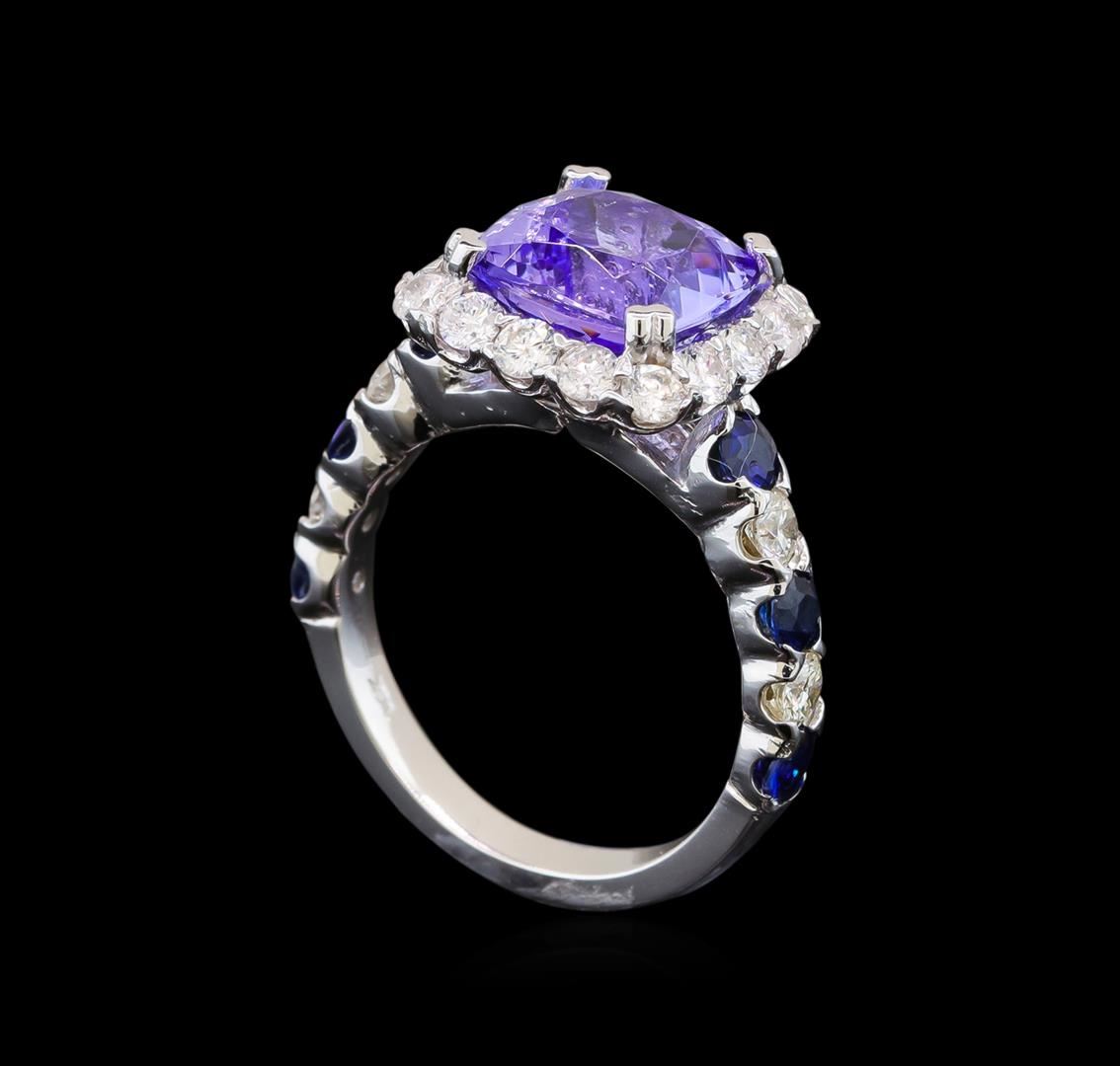 One electronically tested 14KT white gold ladies cast tanzanite, sapphire and diamond ring with a bright polish finish. Identified with markings of "14K". Condition is new. Containing: One prong set square cushion modified mixed cut natural tanzanite, measuring 8.80 x 8.80 x 5.72mm, approximate weight of 3.49ct., clarity is eye clean, type I, medium light, slightly grayish, violet color, (GIA V 4/2), cut is good. Six prong set round modified brilliant cut natural blue sapphires, measuring 3.00 - 3.00 x 1.95 mm, approximate total weight of 0.84ct., clarity is slightly included, type II, medium, very slightly grayish, blue color, (GIA B 5/3), cut is good. Twenty prong set round brilliant cut diamonds, measuring 2.50 - 2.00 x 1.35mm (depth est.) approximate total weight of 20 Stones = 0.83ct. Clarity: SI-1 to I-1. Color: J, Cut is Good. Colored gemstones are presumed to have been subjected to commonly used enhancement processes. All diamonds and colored gemstones are graded in the mounting, unless otherwise stated. Total Weight of Colored Stones 4.33ct. Total Weight of Diamonds 0.83ct. Total Weight of Ring 5.60 grams. GGL Appraised.