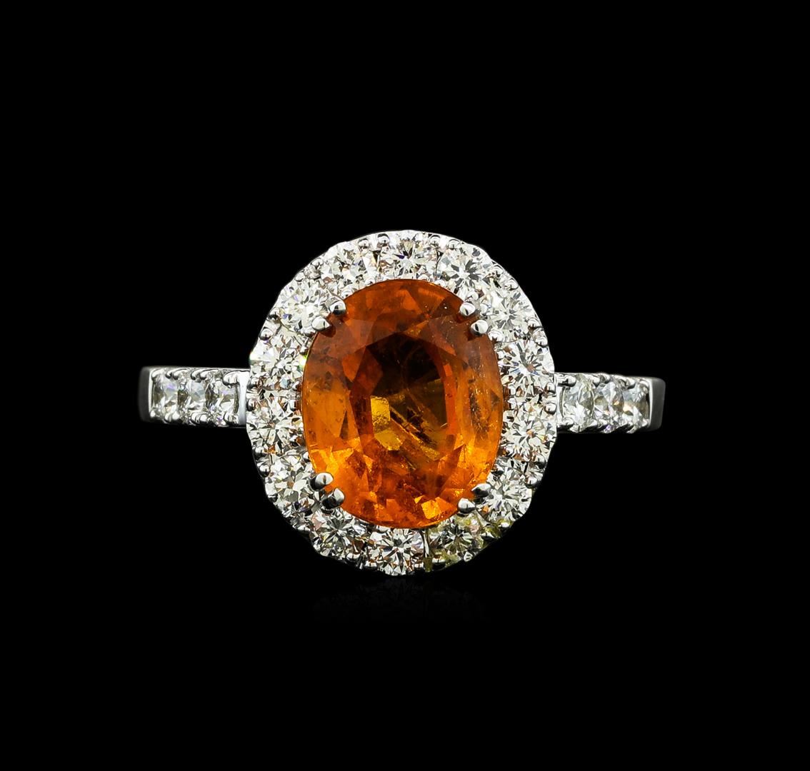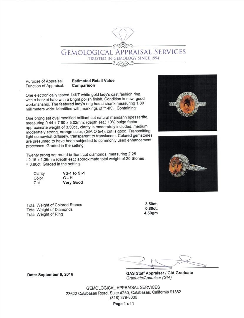 One electronically tested 14KT white gold lady's cast fashion ring with a basket halo with a bright polish finish. The featured lady's ring has a shank measuring 1.80 millimeters wide. Identified with markings of "14K". Condition is new, good workmanship. Containing: One prong set oval modified brilliant cut natural mandarin spessartite, measuring 9.44 x 7.60 x 5.02mm, (depth est.) 10%. bulge factor, approximate weight of 3.50ct., clarity is moderately included, medium, moderately strong, orange color, (GIA O 5/4), cut is good. Transmitting light somewhat diffusely, transparent to translucent. Colored gemstones are presumed to have been subjected to commonly used enhancement processes. Graded in the setting.Twenty prong set round brilliant cut diamonds, measuring 2.25 - 2.15 x 1.36mm (depth est.) approximate total weight of 20 Stones = 0.80ct. Graded in the setting. Clarity: VS-1 to SI-1. Color: G - HCut Very Good. Total Weight of Colored Stones 3.50ct. Total Weight of Diamonds 0.80ct. Total Weight of Ring 4.50gm. GAS Appraised.