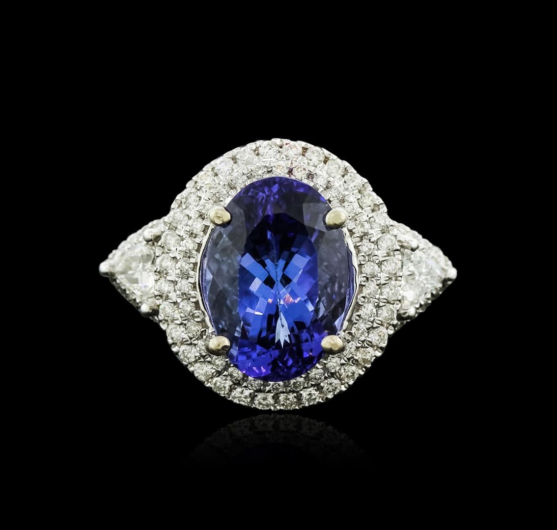 One electronically tested 14KT white gold ladies cast tanzanite and diamond ring with a bright and brushed finish. Identified with markings of "14K". Condition is new. Containing: One prong set oval modified brilliant cut natural tanzanite, measuring 12.50 x 8.50 x 4.68mm, approximate weight of 3.50ct., clarity is eye clean, type I, medium light, very slightly grayish, violet color, (GIA V 4/3), cut is good. Fifty-Two prong set round brilliant cut diamonds, measuring 1.30 - 1.20 x 0.75mm (depth est.) approximate total weight of 52 Stones = 0.37ct. Clarity: SI-1 to I-1. Color: I - J. Two prong set triangle brilliant cut diamonds, measuring 3.50 x 3.50 x 2.17mm (depth est.) approximate total weight of 2 Stones = 0.30ct. Clarity: SI-1. Color: I - J, Cut is Good. Colored gemstones are presumed to have been subjected to commonly used enhancement processes. All diamonds and colored gemstones are graded in the mounting, unless otherwise stated. Total Weight of Colored Stones 3.50ct. Total Weight of Diamonds 0.67ct. Total Weight of Ring 6.00. grams. GGL Appraised at $4,595.00.