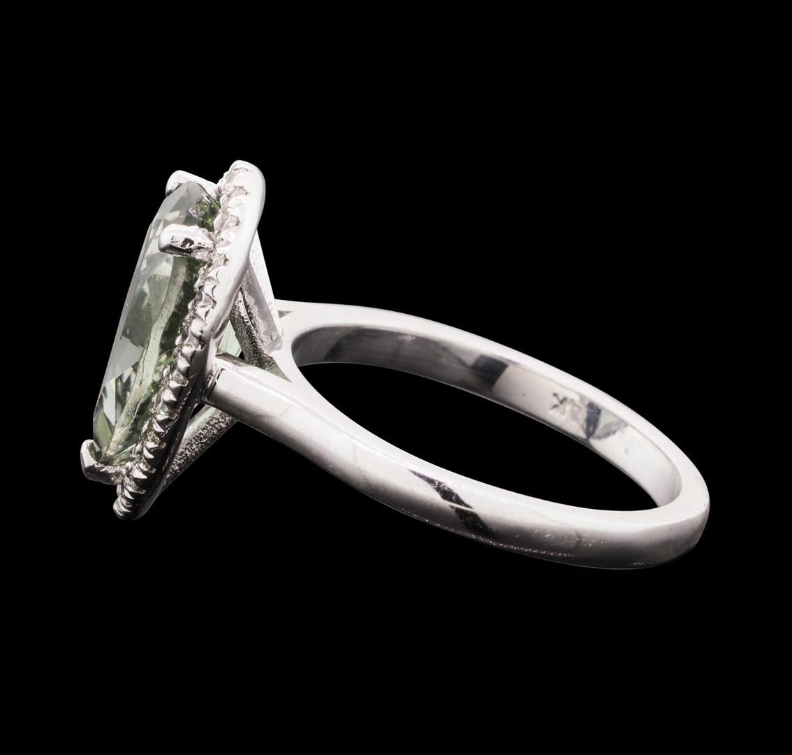 One electronically tested 14KT white gold lady's cast fashion ring with a basket halo with a bright polish finish. The featured lady's ring has a shank measuring 2.15 millimeters wide. Identified with markings of "14K". Condition is new, good workmanship. Containing: One prong set pear modified brilliant cut natural green tourmaline, measuring 12.70 x 8.70 x 5.10mm, (depth est.) approximate weight of 3.51ct., clarity is slightly included, medium, very slightly grayish, slightly yellowish green color, (GIA slyG 5/3), cut is very good. Transmitting light with a minimum of distortion, transparent. Colored gemstones are presumed to have been subjected to commonly used enhancement processes. Graded in the setting. Twenty-Four prong set round brilliant cut diamonds, measuring 1.50 - 1.45 x 0.92mm (depth est.) approximate total weight of 24 Stones = 0.30ct. Graded in the setting. Color H - I Clarity SI-1 to SI-2 Cut Good. Total Weight of Colored Stones 3.51ct. Total Weight of Diamonds 0.30ct. Total Weight of Ring 4.20gm. GAS Appraised.