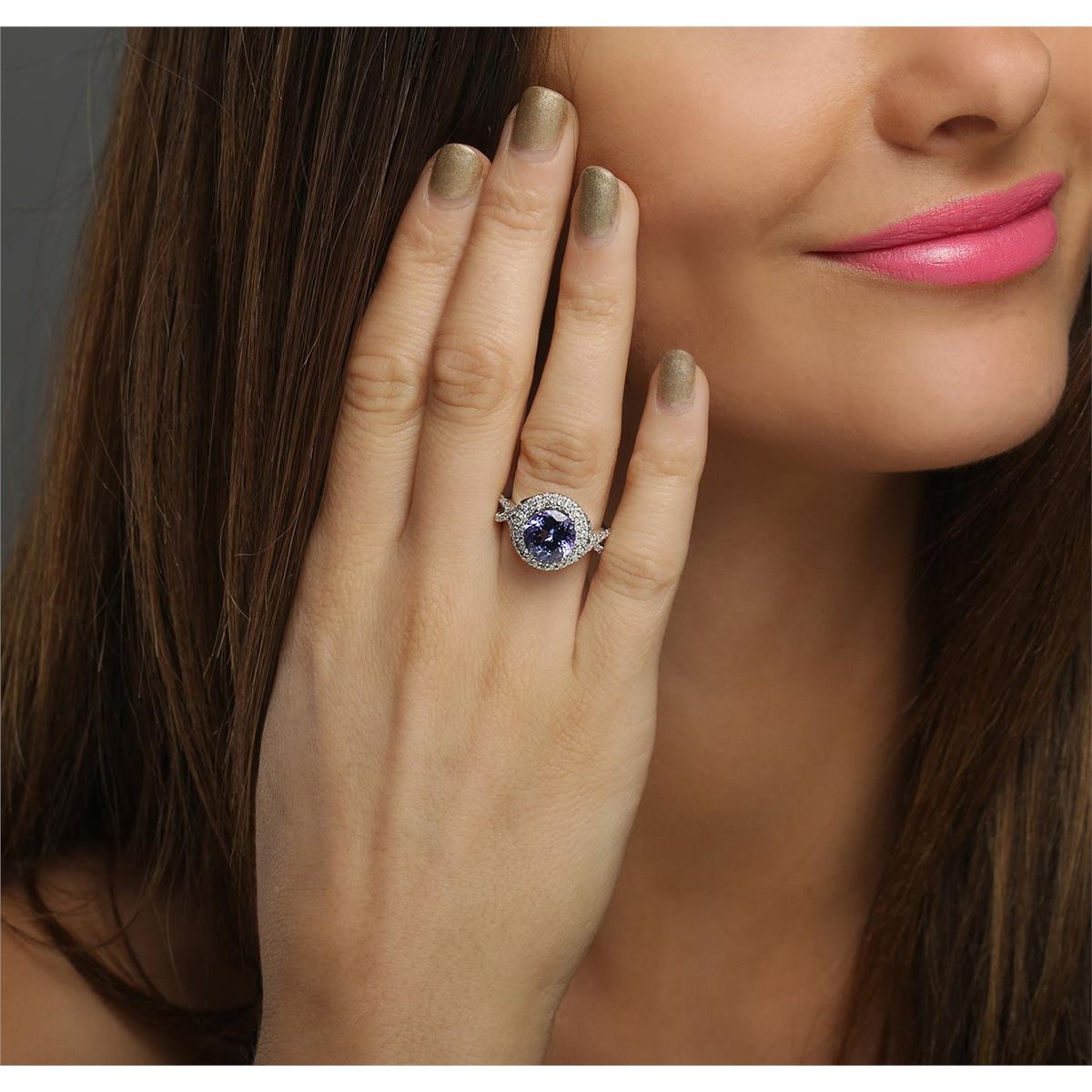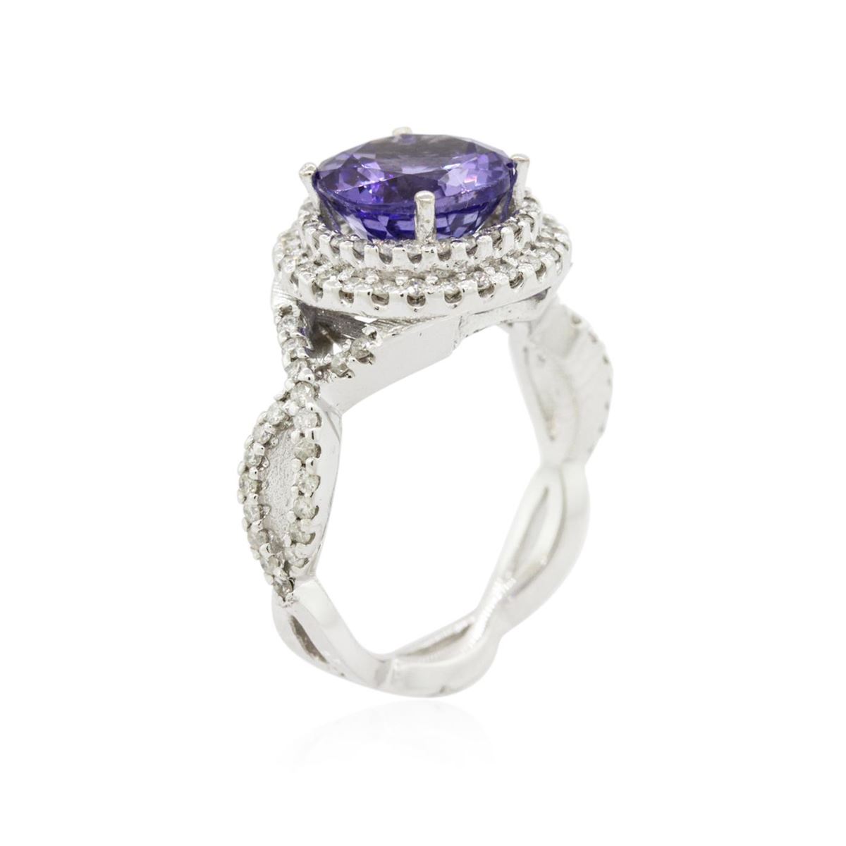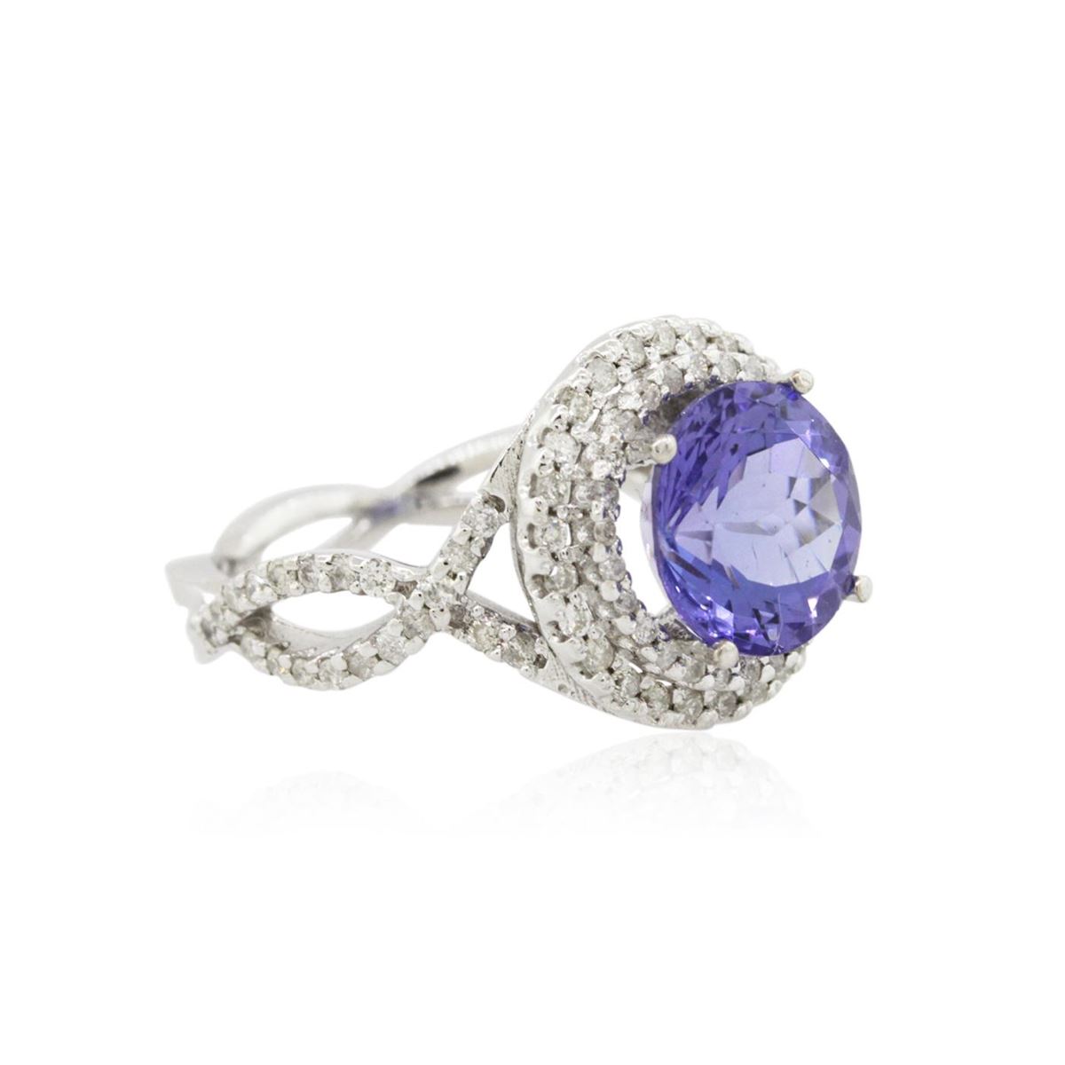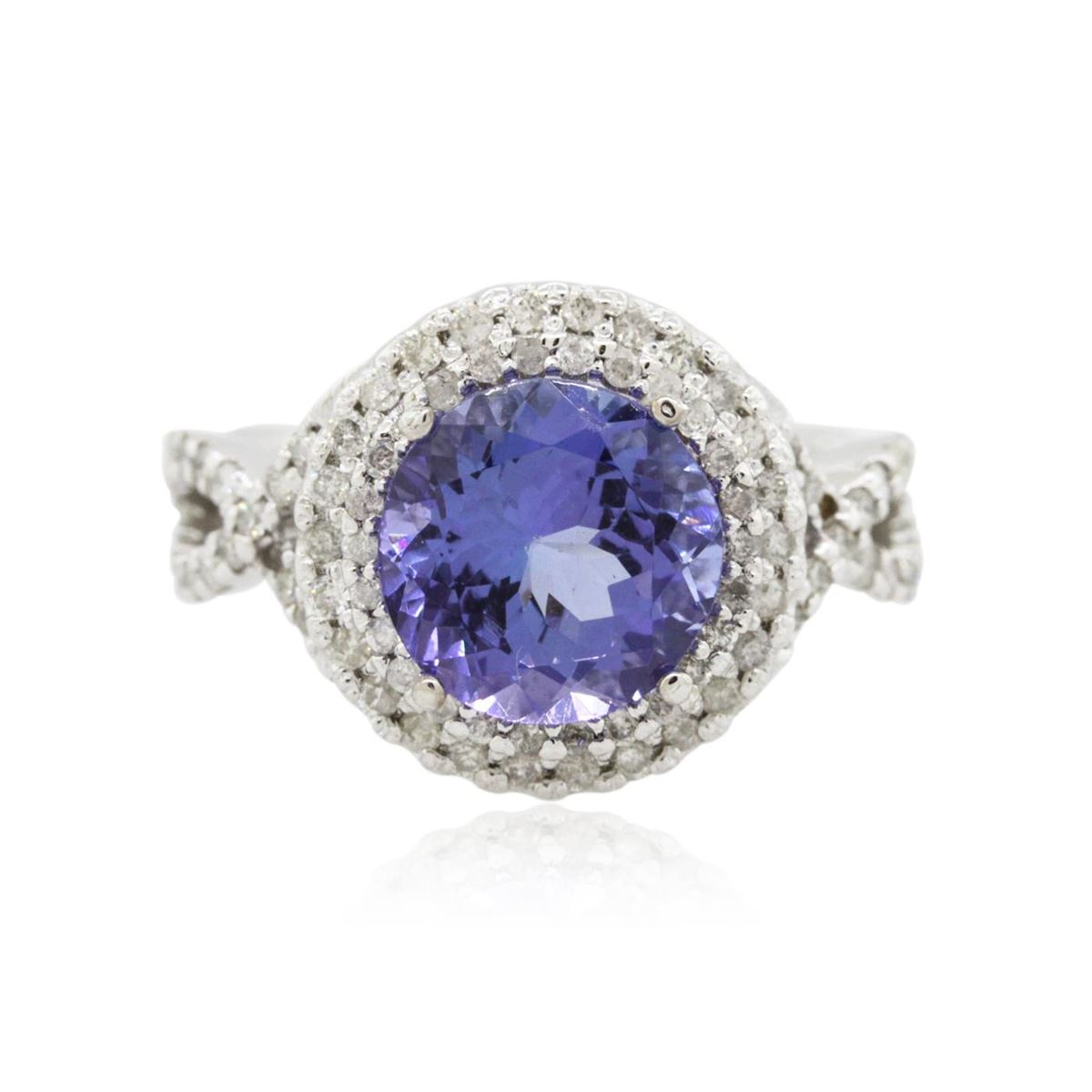 One electronically tested 14KT white gold ladies combination cast & assembled engagement ring with a bright polish finish. Identified with markings of "K14". Condition is new. Containing: One prong set round modified brilliant cut natural tanzanite, measuring 9.30 - 9.30 x 6.05 mm, approximate weight of 3.51ct., clarity is eye clean, type I, medium light, moderately strong, bluish violet color, (GIA bV 4/4), cut is good. Eighty-Eight prong set round brilliant cut diamonds, measuring 1.30 - 1.30 x 0.78mm (depth est.) approximate total weight of 88 Stones = 0.70ct. Clarity: I-1 to I-3. Color: I - J, Cut is Good. Colored gemstones are presumed to have been subjected to commonly used enhancement processes. All diamonds and colored gemstones are graded in the mounting, unless otherwise stated. Total Weight of Colored Stones 3.51ct. Total Weight of Diamonds 0.70ct. Total Weight of Ring 6.50 grams. GGL Appraised at $8,835.00.