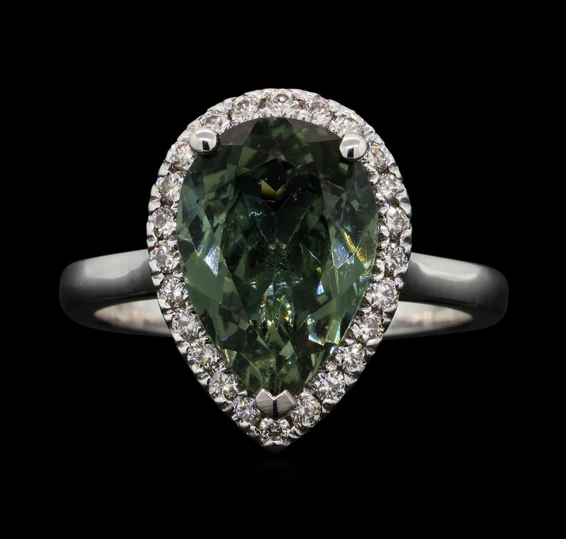 One electronically tested 14KT white gold lady's cast fashion ring with a basket halo with a bright polish finish. The featured lady's ring has a shank measuring 2.15 millimeters wide. Identified with markings of "14K". Condition is new, good workmanship. Containing: One prong set pear modified brilliant cut natural green tourmaline, measuring 12.70 x 8.70 x 5.10mm, (depth est.) approximate weight of 3.51ct., clarity is slightly included, medium, very slightly grayish, slightly yellowish green color, (GIA slyG 5/3), cut is very good. Transmitting light with a minimum of distortion, transparent. Colored gemstones are presumed to have been subjected to commonly used enhancement processes. Graded in the setting. Twenty-Four prong set round brilliant cut diamonds, measuring 1.50 - 1.45 x 0.92mm (depth est.) approximate total weight of 24 Stones = 0.30ct. Graded in the setting. Color H - I Clarity SI-1 to SI-2 Cut Good. Total Weight of Colored Stones 3.51ct. Total Weight of Diamonds 0.30ct. Total Weight of Ring 4.20gm. GAS Appraised.