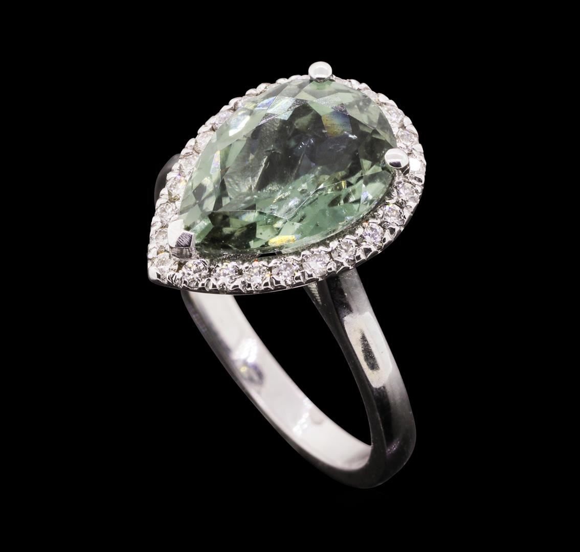 One electronically tested 14KT white gold lady's cast fashion ring with a basket halo with a bright polish finish. The featured lady's ring has a shank measuring 2.15 millimeters wide. Identified with markings of "14K". Condition is new, good workmanship. Containing: One prong set pear modified brilliant cut natural green tourmaline, measuring 12.70 x 8.70 x 5.10mm, (depth est.) approximate weight of 3.51ct., clarity is slightly included, medium, very slightly grayish, slightly yellowish green color, (GIA slyG 5/3), cut is very good. Transmitting light with a minimum of distortion, transparent. Colored gemstones are presumed to have been subjected to commonly used enhancement processes. Graded in the setting. Twenty-Four prong set round brilliant cut diamonds, measuring 1.50 - 1.45 x 0.92mm (depth est.) approximate total weight of 24 Stones = 0.30ct. Graded in the setting. Color H - I Clarity SI-1 to SI-2 Cut Good. Total Weight of Colored Stones 3.51ct. Total Weight of Diamonds 0.30ct. Total Weight of Ring 4.20gm. GAS Appraised.