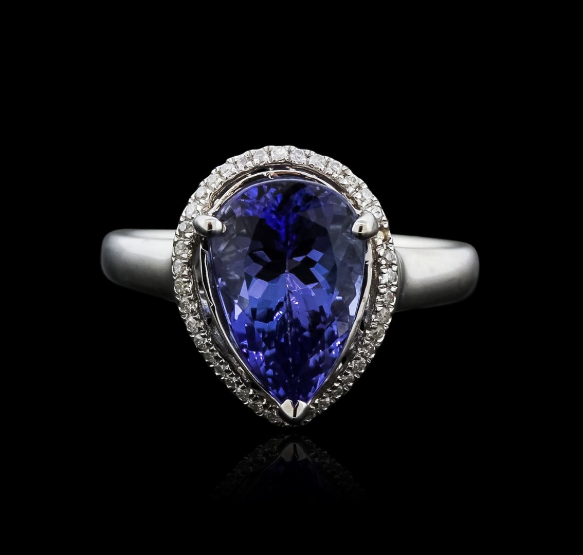 One electronically tested 14KT white gold ladies cast tanzanite and diamond ring with a half round shank with a bright polish finish. Trademark is Orianne. Identified with markings of "14K". Condition is new. Containing: One prong set pear modified brilliant cut natural tanzanite, measuring 11.27 x 7.74 x 6.00mm, approximate weight of 3.51ct., clarity is eye clean, type I, medium, moderately strong, violetish blue color, (GIA vB 5/4), cut is good. Thirty-Nine prong set round brilliant cut diamonds, measuring 1.00 - 1.00 x 0.60mm (depth est.) approximate total weight of 39 Stones = 0.14ct. Clarity: SI-2 to I-2. Color: I - J. All diamonds and colored gemstones are graded in the mounting, unless otherwise stated. Colored gemstones are presumed to have been subjected to commonly used enhancement processes. Total Weight of Colored Stones 3.51ct. Total Weight of Diamonds 0.14ct. Total Weight of Ring 3.90 grams. GGL Appraised at $3,605.00.