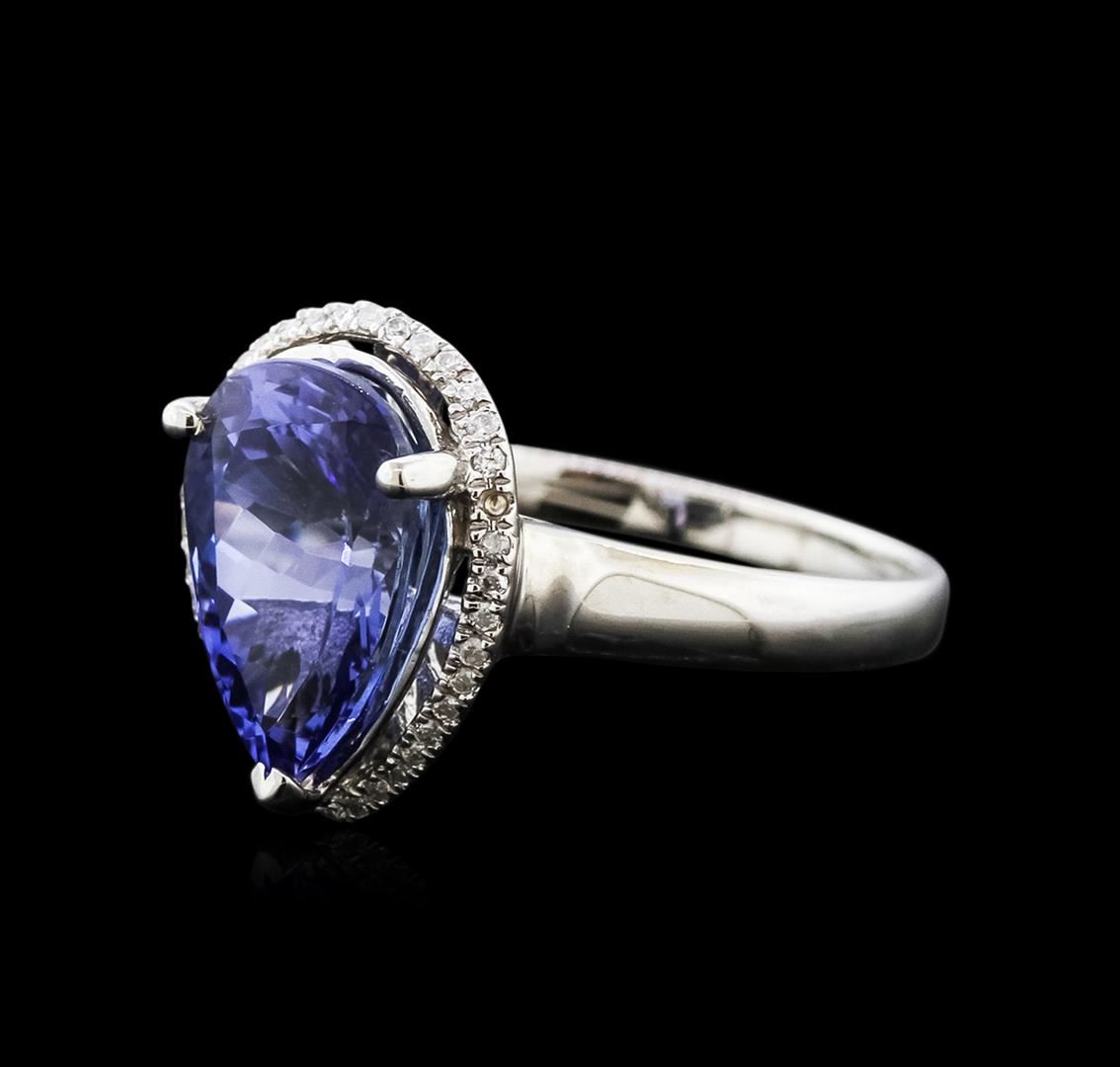 One electronically tested 14KT white gold ladies cast tanzanite and diamond ring with a half round shank with a bright polish finish. Trademark is Orianne. Identified with markings of "14K". Condition is new. Containing: One prong set pear modified brilliant cut natural tanzanite, measuring 11.27 x 7.74 x 6.00mm, approximate weight of 3.51ct., clarity is eye clean, type I, medium, moderately strong, violetish blue color, (GIA vB 5/4), cut is good. Thirty-Nine prong set round brilliant cut diamonds, measuring 1.00 - 1.00 x 0.60mm (depth est.) approximate total weight of 39 Stones = 0.14ct. Clarity: SI-2 to I-2. Color: I - J. All diamonds and colored gemstones are graded in the mounting, unless otherwise stated. Colored gemstones are presumed to have been subjected to commonly used enhancement processes. Total Weight of Colored Stones 3.51ct. Total Weight of Diamonds 0.14ct. Total Weight of Ring 3.90 grams. GGL Appraised at $3,605.00.