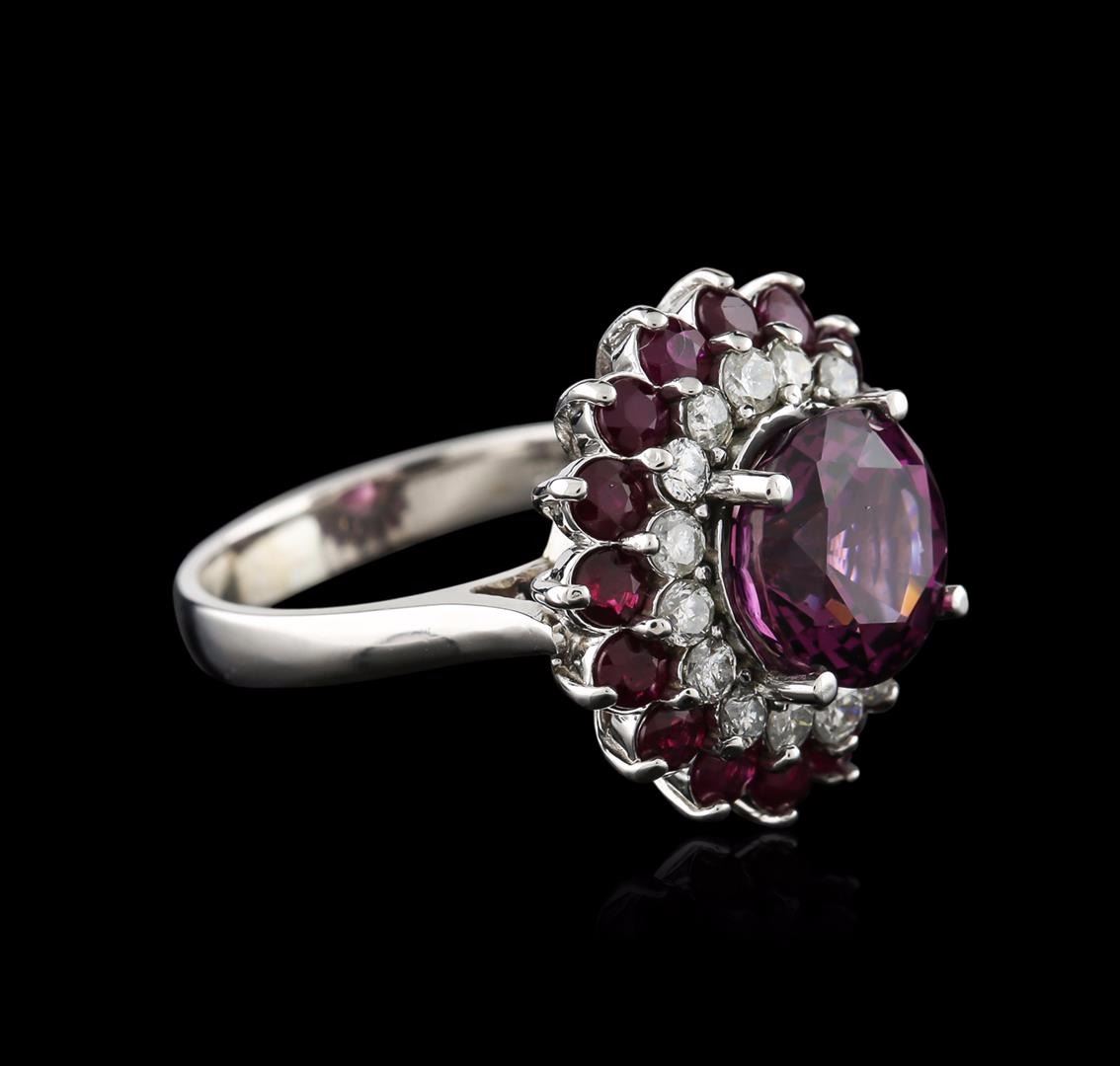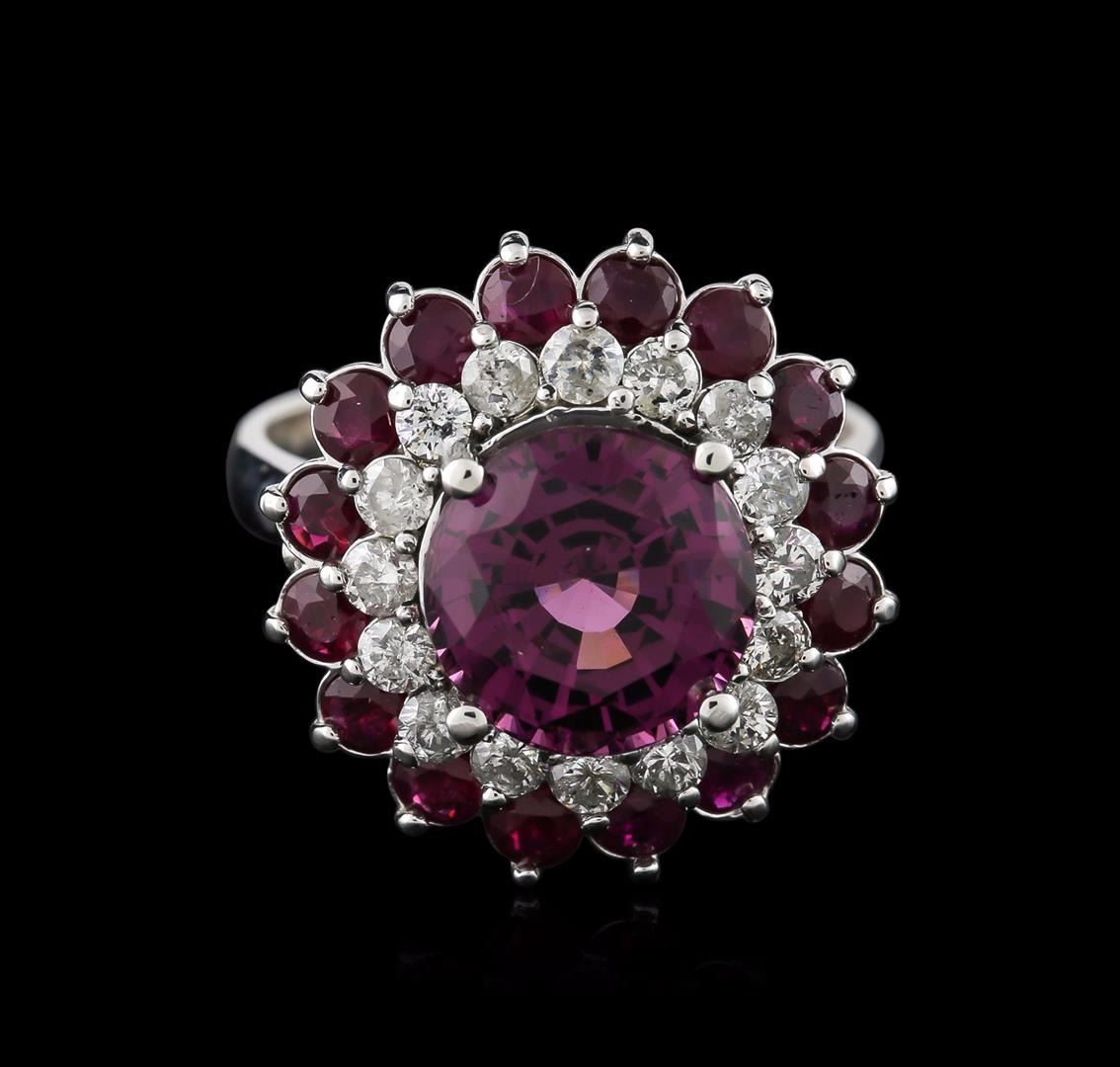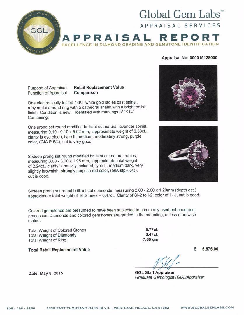 One electronically tested 14KT white gold ladies cast spinel, ruby and diamond ring with a cathedral shank with a bright polish finish. Identified with markings of "K14". Condition is new. Containing: One prong set round modified brilliant cut natural lavender spinel, measuring 9.10 - 9.10 x 5.92 mm, approximate weight of 3.53ct., clarity is eye clean, type II, medium, moderately strong, purple color, (GIA P 5/4), cut is very good. Sixteen prong set round modified brilliant cut natural rubies, measuring 3.00 - 3.00 x 1.95 mm, approximate total weight of 2.24ct., clarity is heavily included, type II, medium dark, very slightly brownish, strongly purplish red color, (GIA stpR 6/3), cut is good. Sixteen prong set round brilliant cut diamonds, measuring 2.00 - 2.00 x 1.20mm (depth est.) approximate total weight of 16 Stones = 0.47ct. Clarity: SI-2 to I-2. Color: I - J, Cut is Good. Colored gemstones are presumed to have been subjected to commonly used enhancement processes. Diamonds and colored gemstones are graded in the mounting, unless otherwise stated. Total Weight of Colored Stones 5.77ct. Total Weight of Diamonds 0.47ct. Total Weight of Ring 7.60 grams. GGL Appraised at $5,675.00.