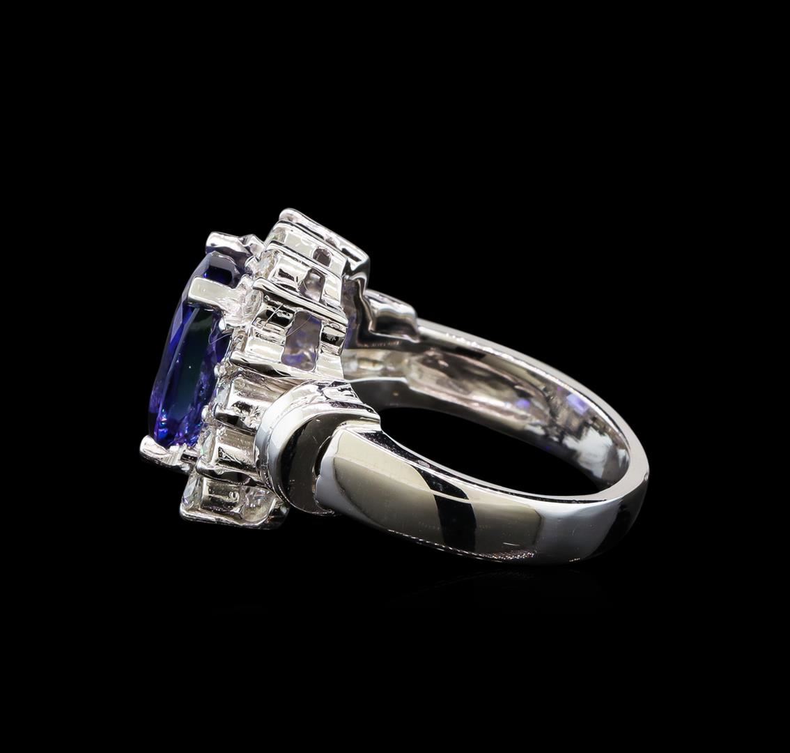 One electronically tested 14KT white gold ladies cast tanzanite and diamond ring with a bright polish finish. Condition is new. Containing: One prong set rectangular cushion modified brilliant cut natural tanzanite, measuring 10.18 x 8.23 x 5.36mm, approximate weight of 3.54ct., clarity is eye clean, type I, medium light, very slightly grayish, violet color, (GIA V 4/3), cut is good. Fourteen prong set round brilliant cut diamonds, measuring 2.40 - 2.40 x 1.44mm (depth est.) approximate total weight of 14 Stones = 0.71ct. Clarity: SI-1 to SI-2. Color: J - K, Cut is Good. Colored gemstones are presumed to have been subjected to commonly used enhancement processes. All diamonds and colored gemstones are graded in the mounting, unless otherwise stated. Total Weight of Colored Stones 3.54ct. Total Weight of Diamonds 0.71ct. Total Weight of Ring 8.50 grams. GGL Appraised.