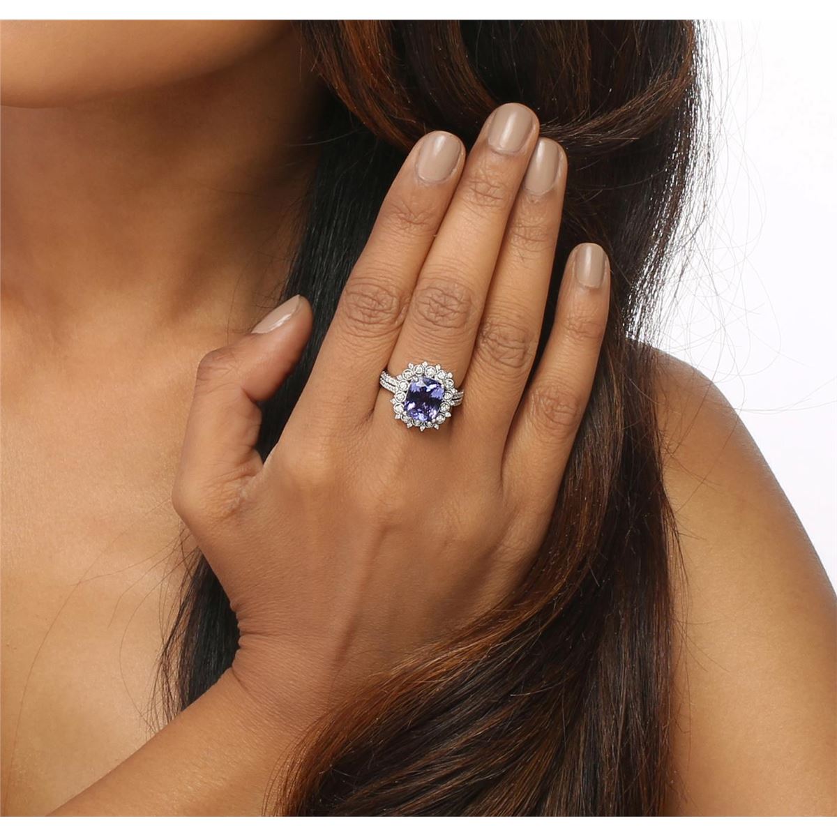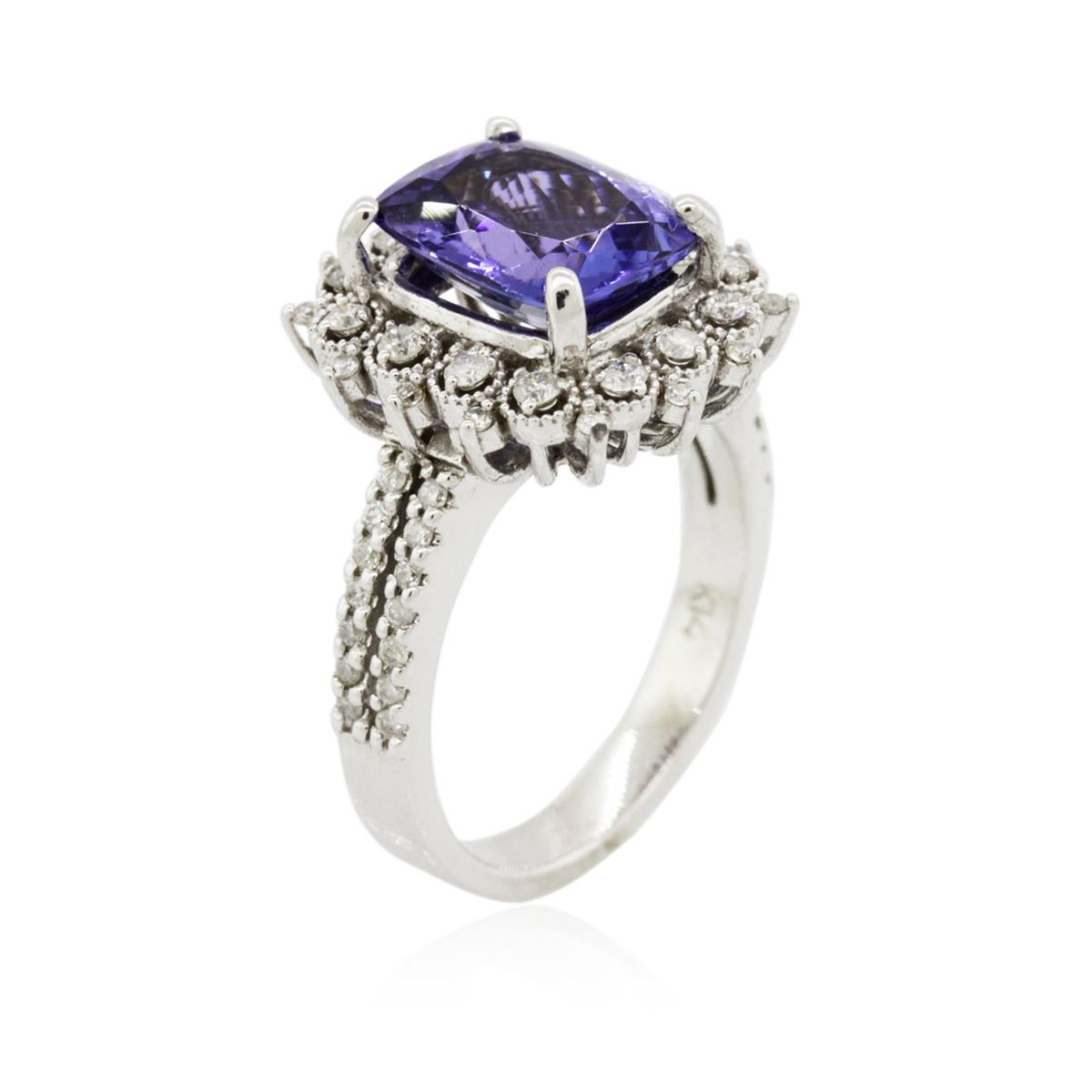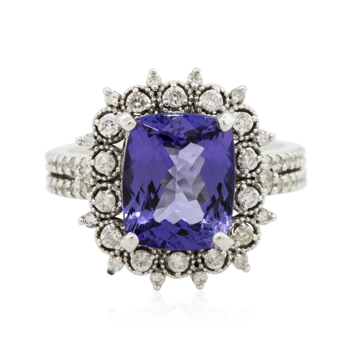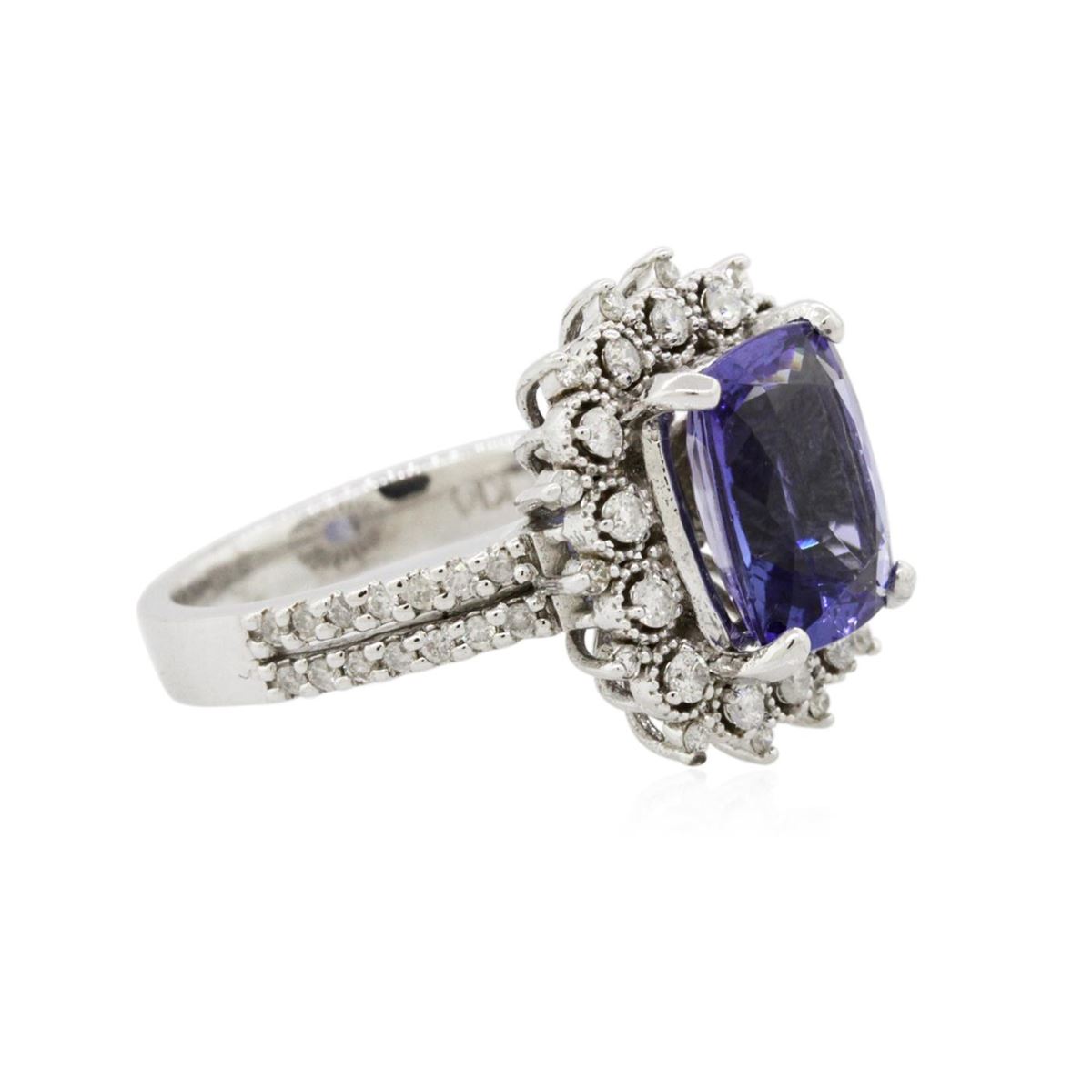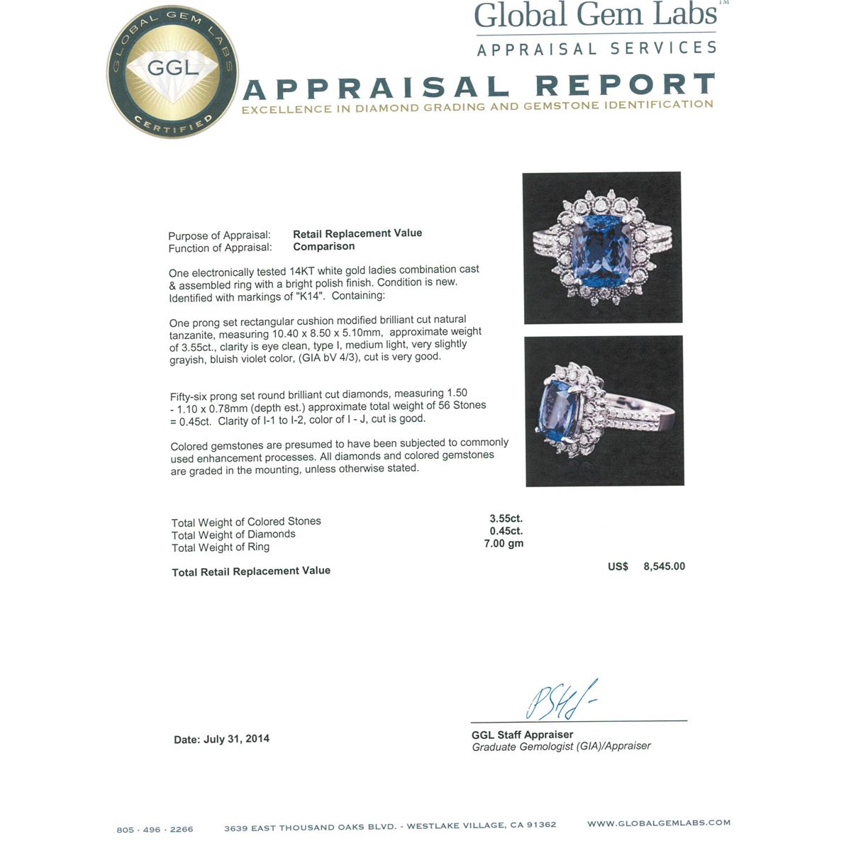 One electronically tested 14KT white gold ladies combination cast & assembled ring with a bright polish finish. Condition is new. Identified with markings of "K14". Containing: One prong set rectangular cushion modified brilliant cut natural tanzanite, measuring 10.40 x 8.50 x 5.10mm, approximate weight of 3.55ct., clarity is eye clean, type I, medium light, very slightly grayish, bluish violet color, (GIA bV 4/3), cut is very good. Fifty-Six prong set round brilliant cut diamonds, measuring 1.50 - 1.10 x 0.78mm (depth est.) approximate. Total Weight of 56 Stones = 0.45ct. Clarity: I-1 to I-2. Color: I - J, Cut is Good. Colored gemstones are presumed to have been subjected to commonly used enhancement processes. All diamonds and colored gemstones are graded in the mounting, unless otherwise stated. Total Weight of Colored Stones 3.55ct. Total Weight of Diamonds 0.45ct. Total Weight of Ring 7.00 grams. GGL Appraised at $8,545.00.