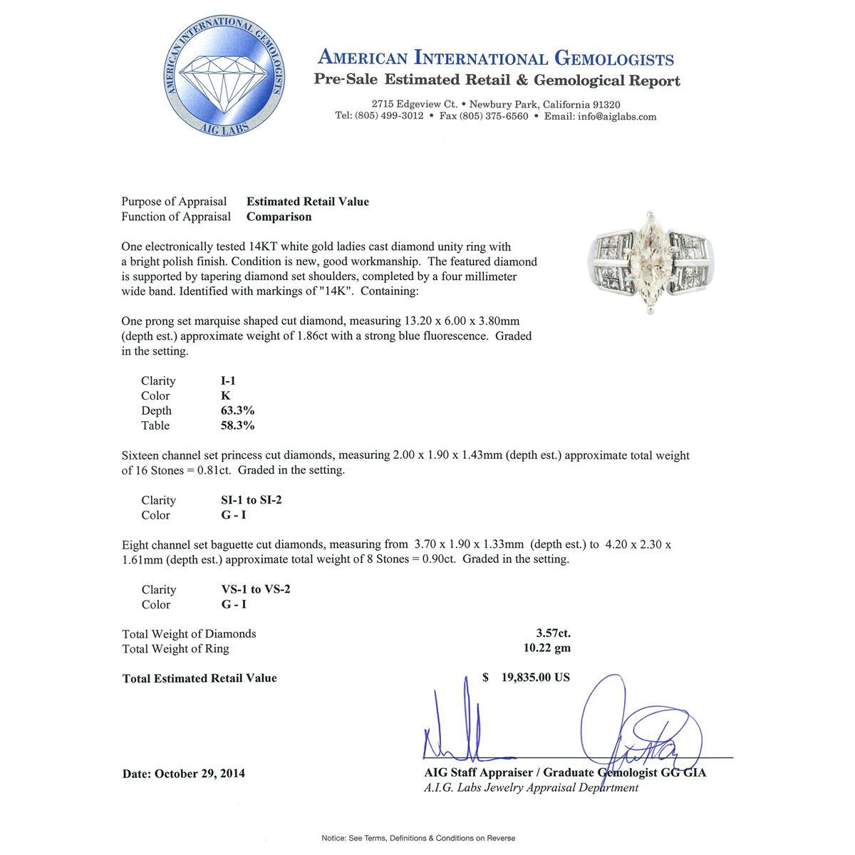 One electronically tested 14KT white gold ladies cast diamond unity ring with a bright polish finish. The featured diamond is supported by tapering diamond set shoulders, completed by a four millimeter wide band. Identified with markings of "14K". Condition is new, good workmanship. Containing: One prong set marquise shaped cut diamond, measuring 13.20 x 6.00 x 3.80mm (depth est.) approximate weight of 1.86ct with a strong blue fluorescence. Graded in the setting. Clarity: I-1. Color: 63.3%. Table 58.3%. Sixteen channel set princess cut diamonds, measuring 2.00 x 1.90 x 1.43mm (depth est.) approximate total weight of 16 Stones = 0.81ct. Graded in the setting. Clarity: SI-1 to SI-2. Color: G - I Eight channel set baguette cut diamonds, measuring from 3.70 x 1.90 x 1.33mm (depth est.) to 4.20 x 2.30 x 1.61mm (depth est.) approximate total weight of 8 Stones = 0.90ct. Graded in the setting. Clarity: VS-1 to VS-2. Color: G - I. Total Weight of Diamonds 3.57ct. Total Weight of Ring 10.22 grams. AIG Appraised at $19,835.00.