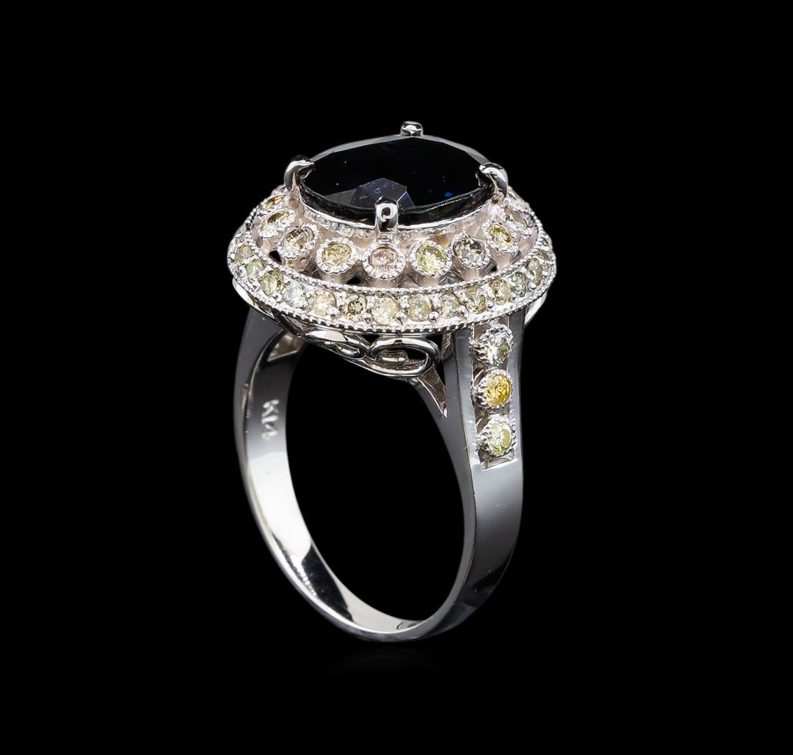 One electronically tested 14KT white gold ladies cast sapphire and diamond ring. The featured sapphire is set within tiered diamond bezels supported by a lattice under gallery and diamond set shoulders, completed by a two millimeter wide band. Bright polish finish with milgrain detailing. Identified with markings of "14K". Condition is new, good workmanship. Containing: One prong set oval mixed cut natural blue sapphire, measuring 10.90 x 8.45 x 4.50mm, 6% bulge factor, approximate weight of 3.57ct., clarity is slightly included, type II, dark, very slightly grayish, very slightly greenish blue color, (GIA vslgB 7/3), cut is good. Transmitting light with a minimum of distortion, transparent. Naturally occurring internal & external characteristics are present. Intermittent color zoning. Graded in the setting. Fifty-Two bezel set round brilliant cut diamonds, measuring 2.00 - 1.70 x 1.11mm (depth est.) approximate total weight of 52 Stones = 1.20ct. Faint brown secondary color throughout. Graded in the setting. Clarity: SI-1 to I-1. Color: K - M. Total Weight of Colored Stones 3.57ct. Total Weight of Diamonds 1.20ct. Total Weight of Ring 6.02 grams. AIG Appraised at $4,300.00.