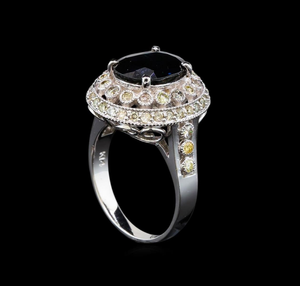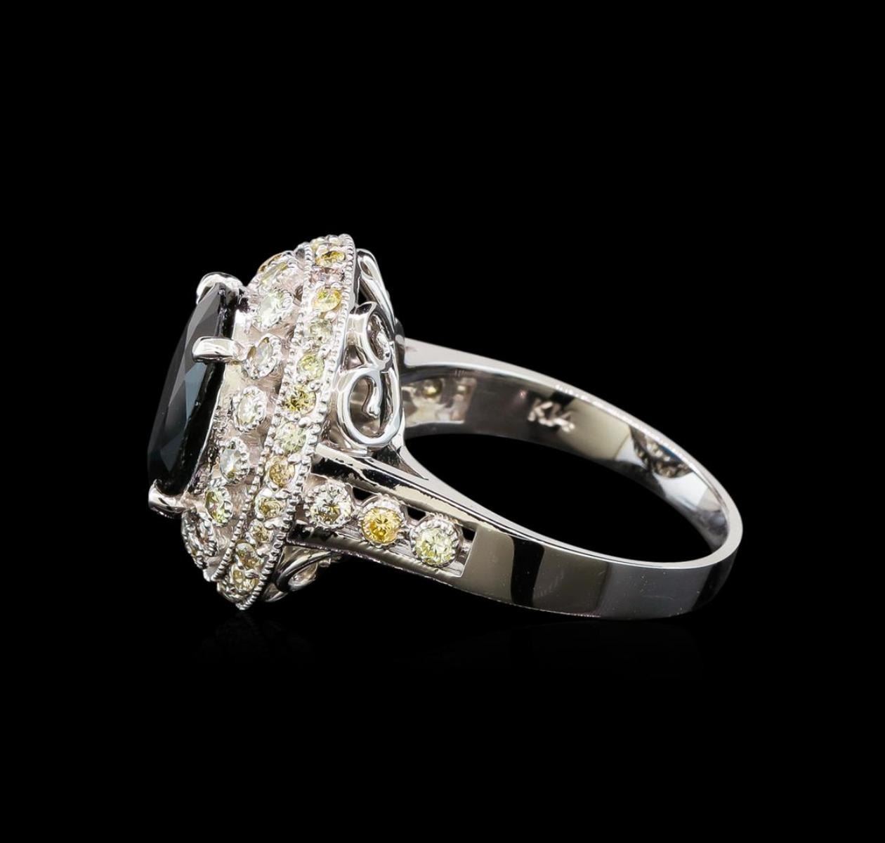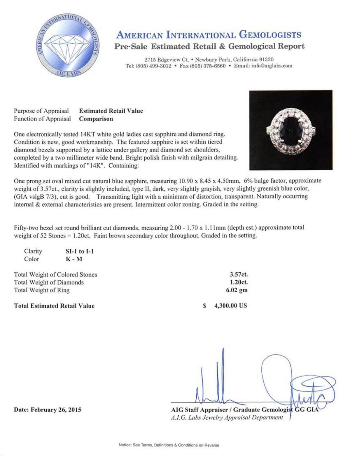 One electronically tested 14KT white gold ladies cast sapphire and diamond ring. The featured sapphire is set within tiered diamond bezels supported by a lattice under gallery and diamond set shoulders, completed by a two millimeter wide band. Bright polish finish with milgrain detailing. Identified with markings of "14K". Condition is new, good workmanship. Containing: One prong set oval mixed cut natural blue sapphire, measuring 10.90 x 8.45 x 4.50mm, 6% bulge factor, approximate weight of 3.57ct., clarity is slightly included, type II, dark, very slightly grayish, very slightly greenish blue color, (GIA vslgB 7/3), cut is good. Transmitting light with a minimum of distortion, transparent. Naturally occurring internal & external characteristics are present. Intermittent color zoning. Graded in the setting. Fifty-Two bezel set round brilliant cut diamonds, measuring 2.00 - 1.70 x 1.11mm (depth est.) approximate total weight of 52 Stones = 1.20 ct. Faint brown secondary color throughout. Graded in the setting. Clarity: SI-1 to I-1. Color: K - M. Total Weight of Colored Stones 3.57ct. Total Weight of Diamonds 1.20 ct. Total Weight of Ring 6.02 grams. AIG Appraised.