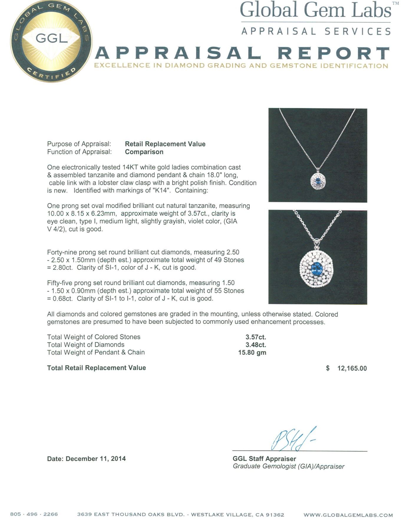 One electronically tested 14KT white gold ladies combination cast & assembled tanzanite and diamond pendant & chain 18.0" long, cable link with a lobster claw clasp with a bright polish finish. Identified with markings of "K14". Condition is new. Containing: One prong set oval modified brilliant cut natural tanzanite, measuring 10.00 x 8.15 x 6.23mm, approximate weight of 3.57ct., clarity is eye clean, type I, medium light, slightly grayish, violet color, (GIA V 4/2), cut is good. Forty-Nine prong set round brilliant cut diamonds, measuring 2.50 - 2.50 x 1.50mm (depth est.) approximate total weight of 49 Stones = 2.80ct. Clarity: SI-1. Color: J - K, Cut is Good. Fifty-Five prong set round brilliant cut diamonds, measuring 1.50 - 1.50 x 0.90mm (depth est.) approximate total weight of 55 Stones = 0.68ct. Clarity: SI-1 to I-1. Color: J - K, Cut is Good. All diamonds and colored gemstones are graded in the mounting, unless otherwise stated. Colored gemstones are presumed to have been subjected to commonly used enhancement processes. Total Weight of Colored Stones 3.57ct. Total Weight of Diamonds 3.48ct. Total Weight of Pendant & Chain 15.80 grams. GGL Appraised.
