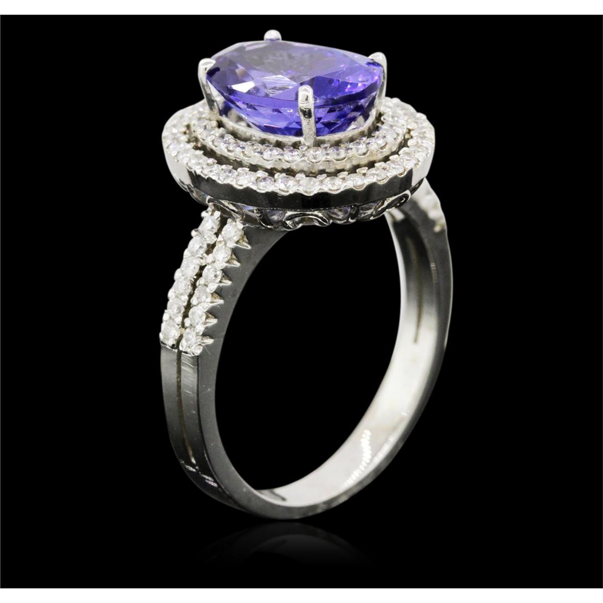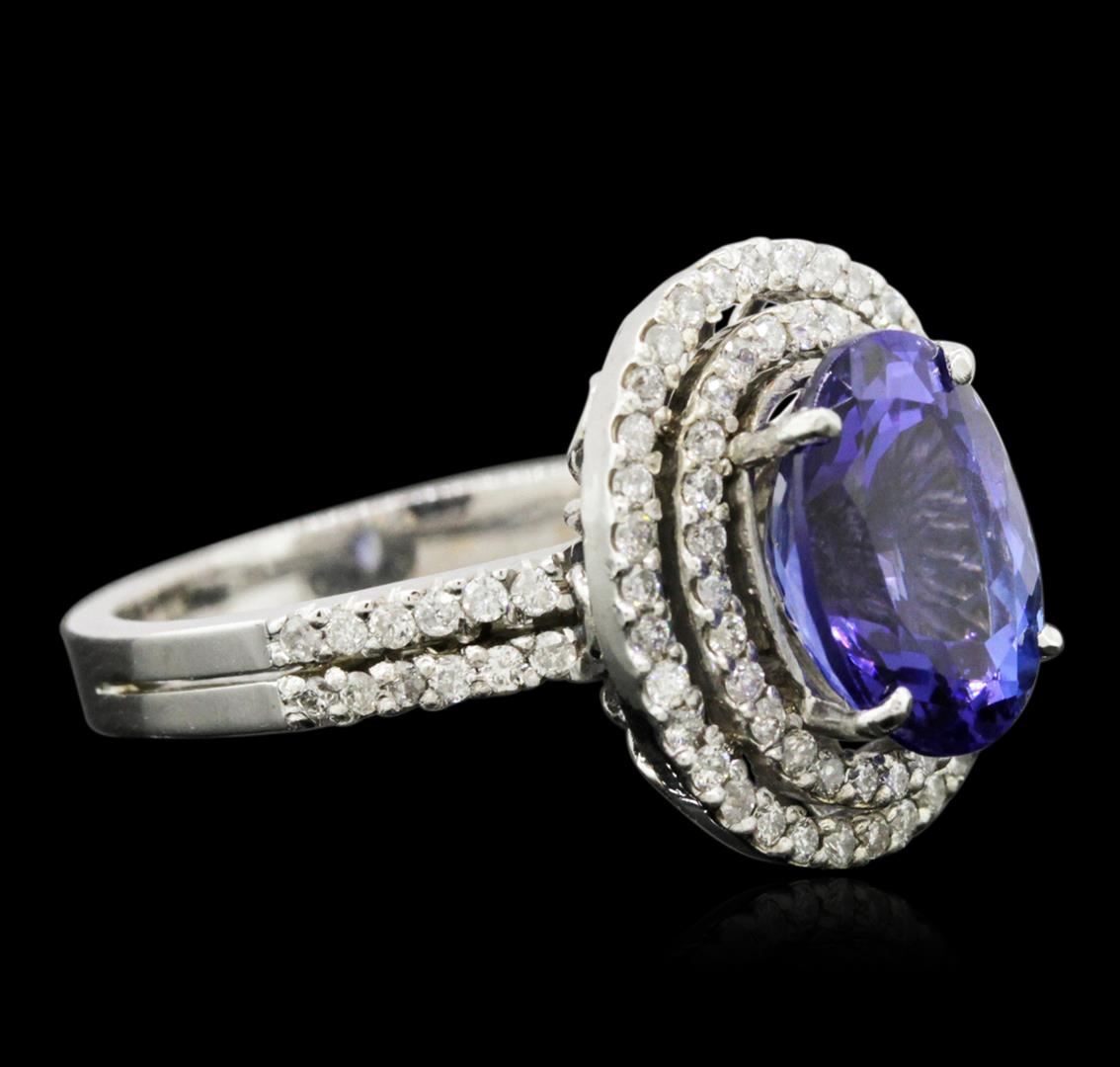 One electronically tested 14KT white gold ladies cast tanzanite and diamond ring with a bright polish finish. Identified with markings of "14K". Condition is new. Containing: One prong set oval modified brilliant cut natural tanzanite, measuring 10.50 x 7.80 x 6.20mm, approximate weight of 3.57ct., clarity is eye clean, type I, medium, moderately strong, violet color, (GIA V 5/4), cut is good. Eighty-Nine prong set round brilliant cut diamonds, measuring 1.30 - 1.30 x 0.78mm (depth est.) approximate total weight of 89 Stones = 0.71ct. Clarity: I-1. Color: H - I, Cut is Good. Colored gemstones are presumed to have been subjected to commonly used enhancement processes. All diamonds and colored gemstones are graded in the mounting, unless otherwise stated. Total Weight of Colored Stones 3.57ct. Total Weight of Diamonds 0.71ct. Total Weight of Ring 5.80 grams. GGL Appraised at $4,955.00.