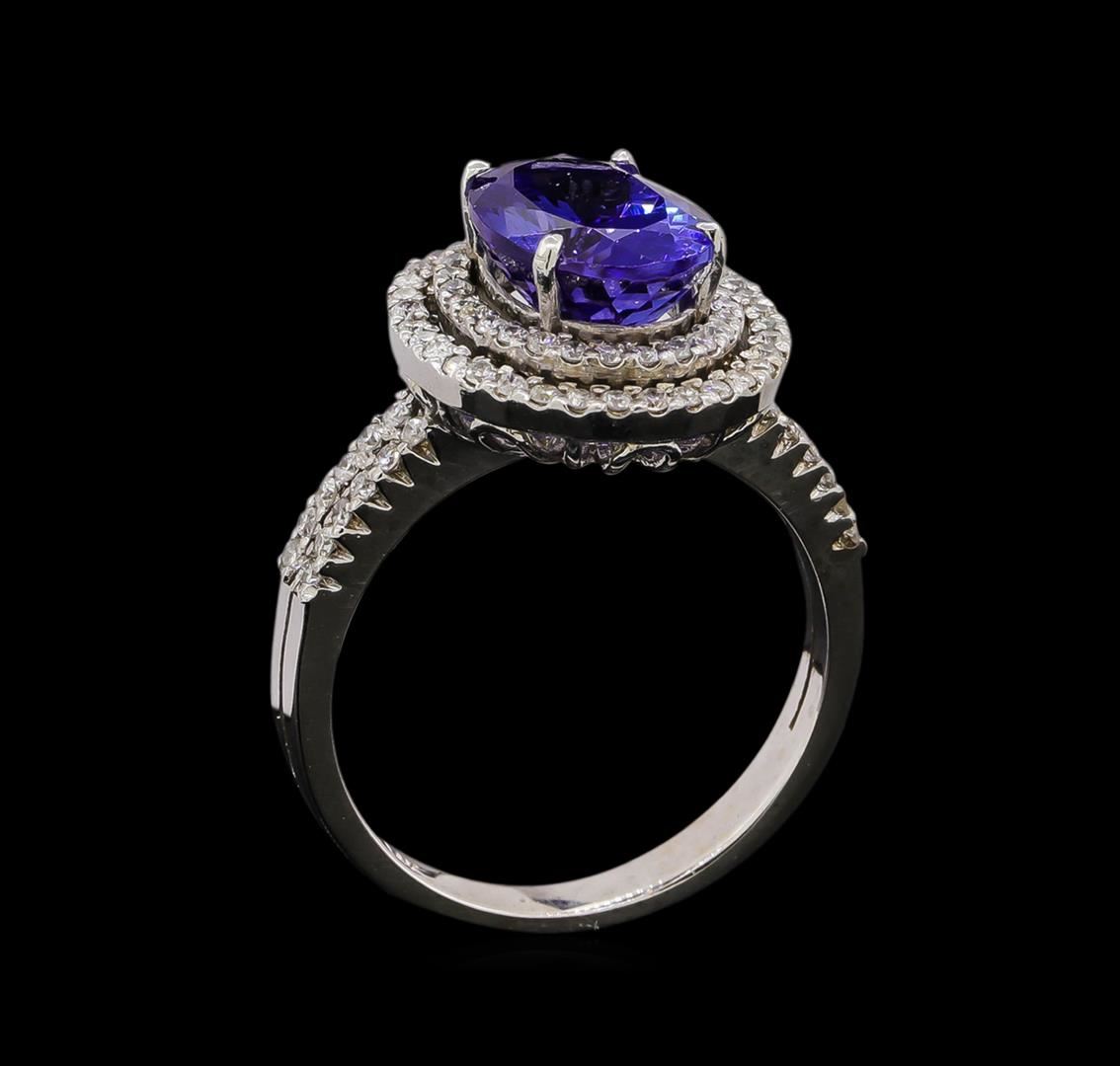 One electronically tested 14KT white gold ladies cast tanzanite and diamond ring with a bright polish finish. Identified with markings of "14K". Condition is new. Containing: One prong set oval modified brilliant cut natural tanzanite, measuring 10.50 x 7.80 x 6.20mm, approximate weight of 3.57ct., clarity is eye clean, type I, medium, moderately strong, violet color, (GIA V 5/4), cut is good. Eighty-Nine prong set round brilliant cut diamonds, measuring 1.30 - 1.30 x 0.78mm (depth est.) approximate total weight of 89 Stones = 0.71ct. Clarity: I-1. Color: H - I, Cut is Good. Colored gemstones are presumed to have been subjected to commonly used enhancement processes. All diamonds and colored gemstones are graded in the mounting, unless otherwise stated. Total Weight of Colored Stones 3.57ct. Total Weight of Diamonds 0.71ct. Total Weight of Ring 5.80 grams. GGL Appraised at $4,955.00.