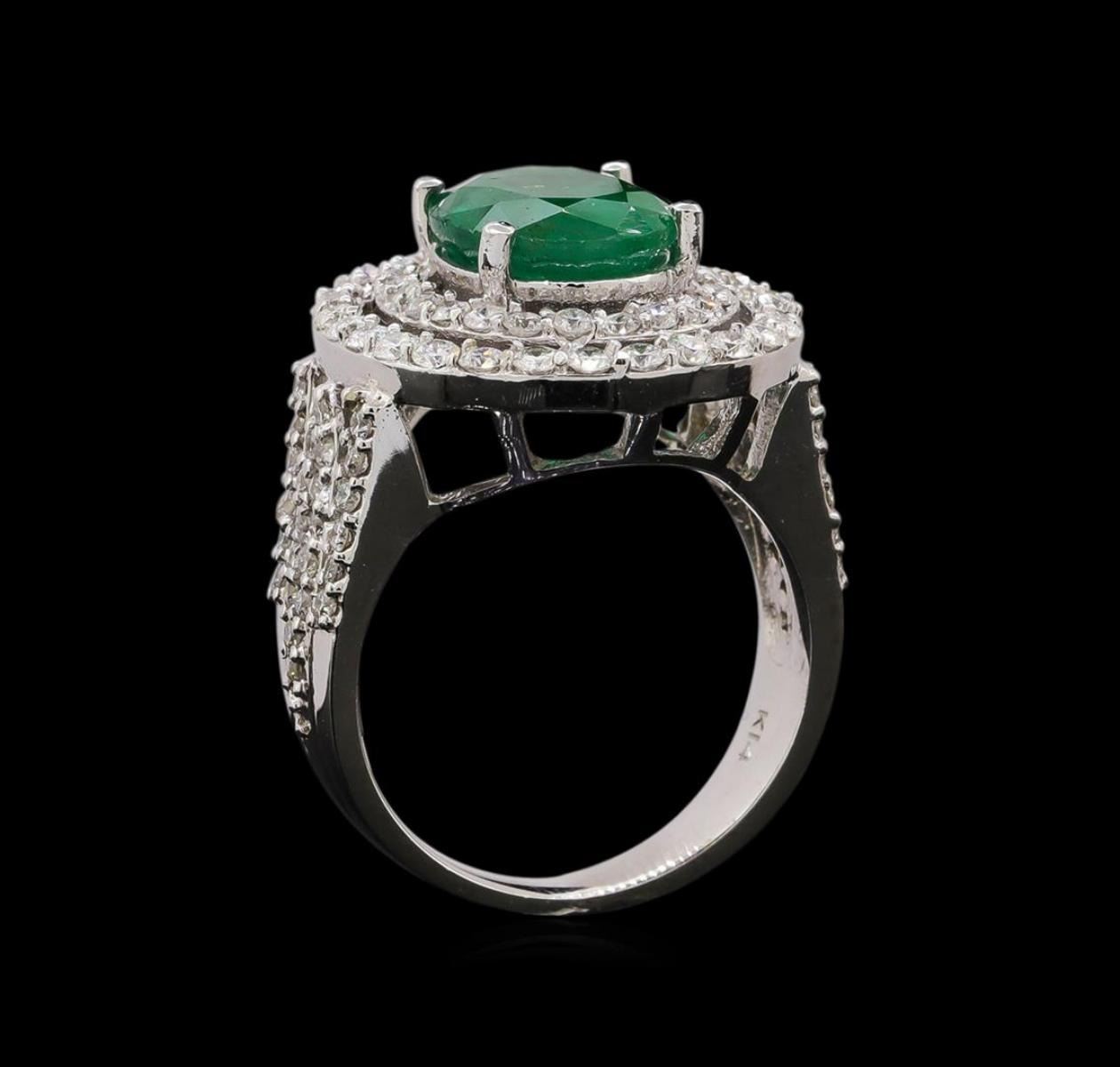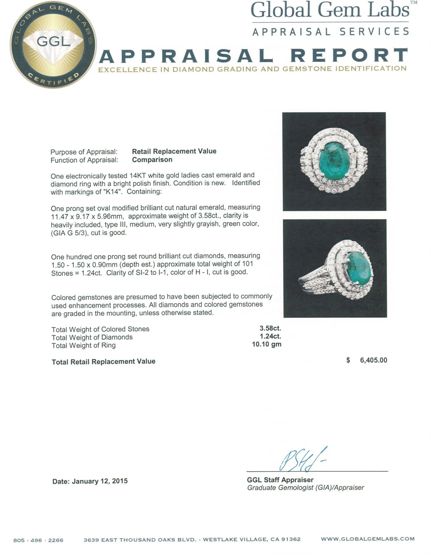 One electronically tested 14KT white gold ladies cast emerald and diamond ring with a bright polish finish. Identified with markings of "K14". Condition is new. Containing: One prong set oval modified brilliant cut natural emerald, measuring 11.47 x 9.17 x 5.96mm, approximate weight of 3.58ct., clarity is heavily included, type III, medium, very slightly grayish, green color, (GIA G 5/3), cut is good. One Hundred One prong set round brilliant cut diamonds, measuring 1.50 - 1.50 x 0.90mm (depth est.) approximate total weight of 101 Stones = 1.24ct. Clarity: SI-2 to I-1. Color: H - I, Cut is Good. Colored gemstones are presumed to have been subjected to commonly used enhancement processes. All diamonds and colored gemstones are graded in the mounting, unless otherwise stated. Total Weight of Colored Stones 3.58ct. Total Weight of Diamonds 1.24ct. Total Weight of Ring 10.10 grams. GGL Appraised at $6,405.00.