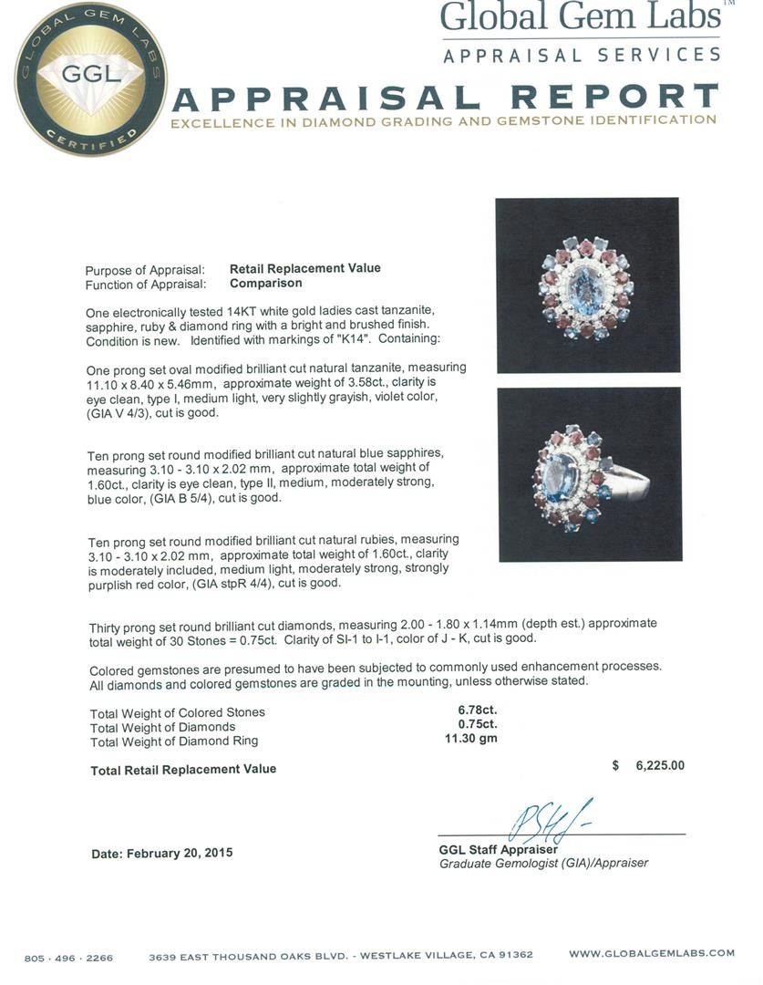 One electronically tested 14KT white gold ladies cast Tanzanite, Sapphire, Ruby and Diamond ring with a bright and brushed finish. Identified with markings of "K14". Condition is new. Containing: One prong set oval modified brilliant cut natural tanzanite, measuring 11.10 x 8.40 x 5.46mm, approximate weight of 3.58ct., clarity is eye clean, type I, medium light, very slightly grayish, violet color, (GIA V 4/3), cut is good. Ten prong set round modified brilliant cut natural blue sapphires, measuring 3.10 - 3.10 x 2.02 mm, approximate total weight of 1.60 ct., clarity is eye clean, type II, medium, moderately strong, blue color, (GIA B 5/4), cut is good. Ten prong set round modified brilliant cut natural rubies, measuring 3.10 - 3.10 x 2.02 mm, approximate total weight of 1.60 ct., clarity is moderately included, medium light, moderately strong, strongly purplish red color, (GIA stpR 4/4), cut is good. Thirty prong set round brilliant cut diamonds, measuring 2.00 - 1.80 x 1.14mm (depth est.) approximate total weight of 30 Stones = 0.75ct. Clarity: SI-1 to I-1. Color: J - K, Cut is Good. Colored gemstones are presumed to have been subjected to commonly used enhancement processes. All diamonds and colored gemstones are graded in the mounting, unless otherwise stated. Total Weight of Colored Stones 6.78ct. Total Weight of Diamonds 0.75ct. Total Weight of Ring 11.30 grams. GGL Appraised.