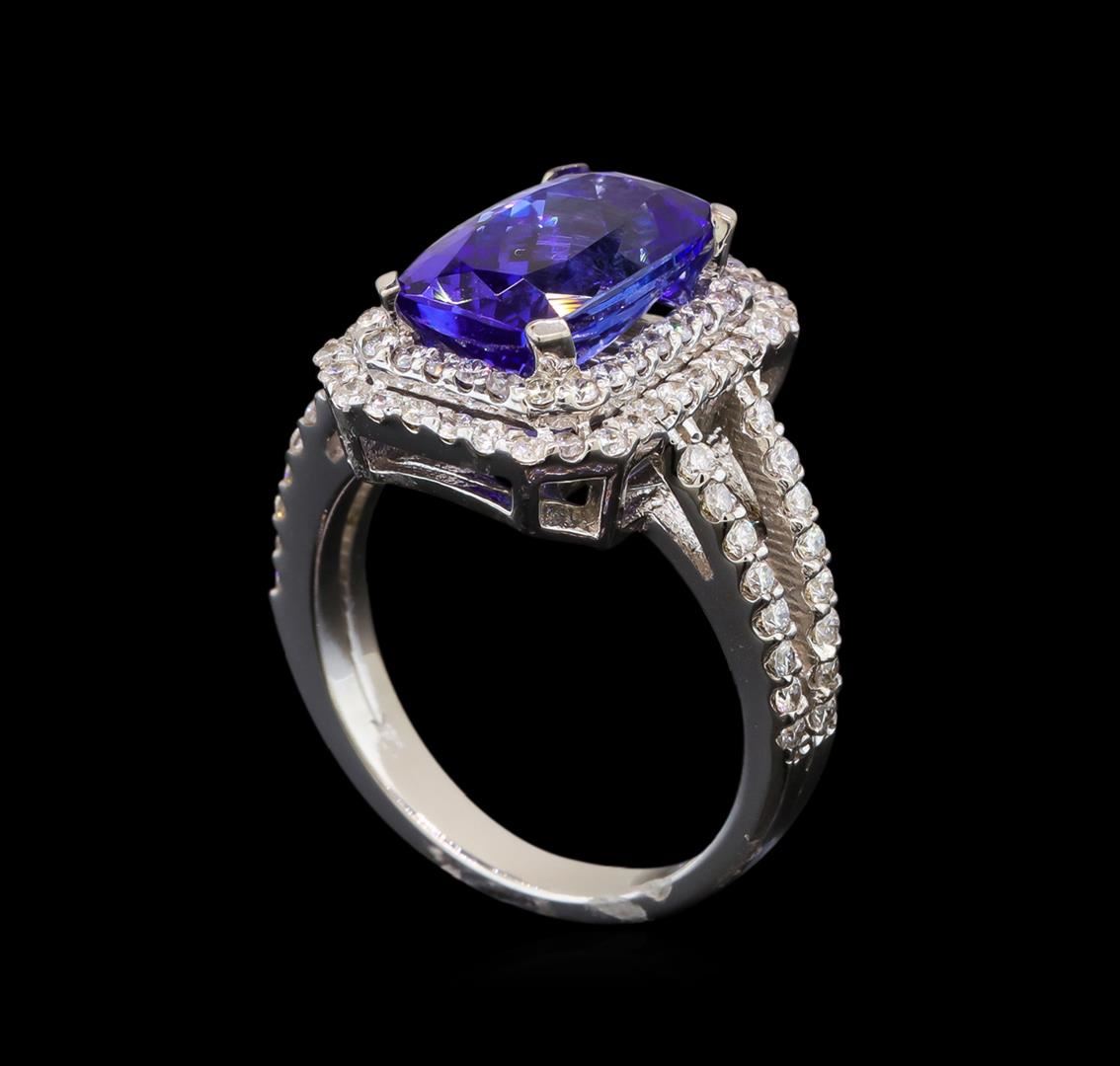 One electronically tested 14KT white gold ladies cast tanzanite and diamond ring with a bright polish finish. Identified with markings of "K14". Condition is new. Containing: One prong set rectangular cushion modified brilliant cut natural tanzanite, measuring 12.10 x 7.60 x 4.94mm, approximate weight of 3.58ct., clarity is eye clean, type I, medium light, very slightly grayish, violet color, (GIA V 4/3), cut is good. Ninety-Four prong set round brilliant cut diamonds, measuring 1.50 - 1.30 x 0.84mm (depth est.) approximate total weight of 94 Stones = 0.94ct. Clarity: SI-1 to I-1. Color: H - I, Cut is Good. Colored gemstones are presumed to have been subjected to commonly used enhancement processes. All diamonds and colored gemstones are graded in the mounting, unless otherwise stated. Total Weight of Colored Stones 3.58ct. Total Weight of Diamonds 0.94ct. Total Weight of Ring 8.30 grams. GGL Appraised at $5,510.00.