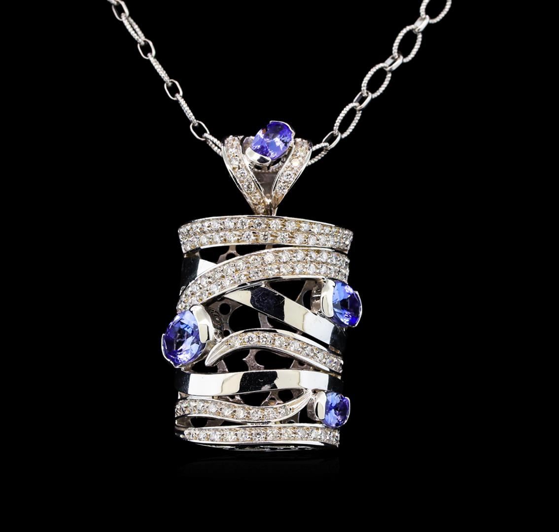 One electronically tested 14KT white gold ladies cast tanzanite and diamond pendant & chain 18.0" long, with a lobster claw clasp with a bright polish finish. Identified with markings of "585". Condition is new. Containing: Two prong set oval modified brilliant cut natural tanzanites, measuring 7.00 x 5.00 x 3.25mm, approximate total weight of 2.54ct., clarity is eye clean, type I, medium light, very slightly grayish, violet color, (GIA V 4/3), cut is good. Two prong set oval modified brilliant cut natural tanzanites, measuring 6.00 x 4.00 x 2.60mm, approximate total weight of 1.06ct., clarity is eye clean, type I, medium light, slightly grayish, violet color, (GIA V 4/2), cut is good. One Hundred Sixteen prong set round brilliant cut diamonds, measuring 1.20 - 1.20 x 0.72mm (depth est.) approximate total weight of 116 Stones = 1.15ct. Clarity: SI-1 to SI-2. Color: H - I, Cut is Good. Colored gemstones are presumed to have been subjected to commonly used enhancement processes. All diamonds and colored gemstones are graded in the mounting, unless otherwise stated. Total Weight of Colored Stones 3.60ct. Total Weight of Diamonds 1.15ct. Total Weight of Pendant & Chain 19.40 grams. GGL Appraised at $7,130.00.