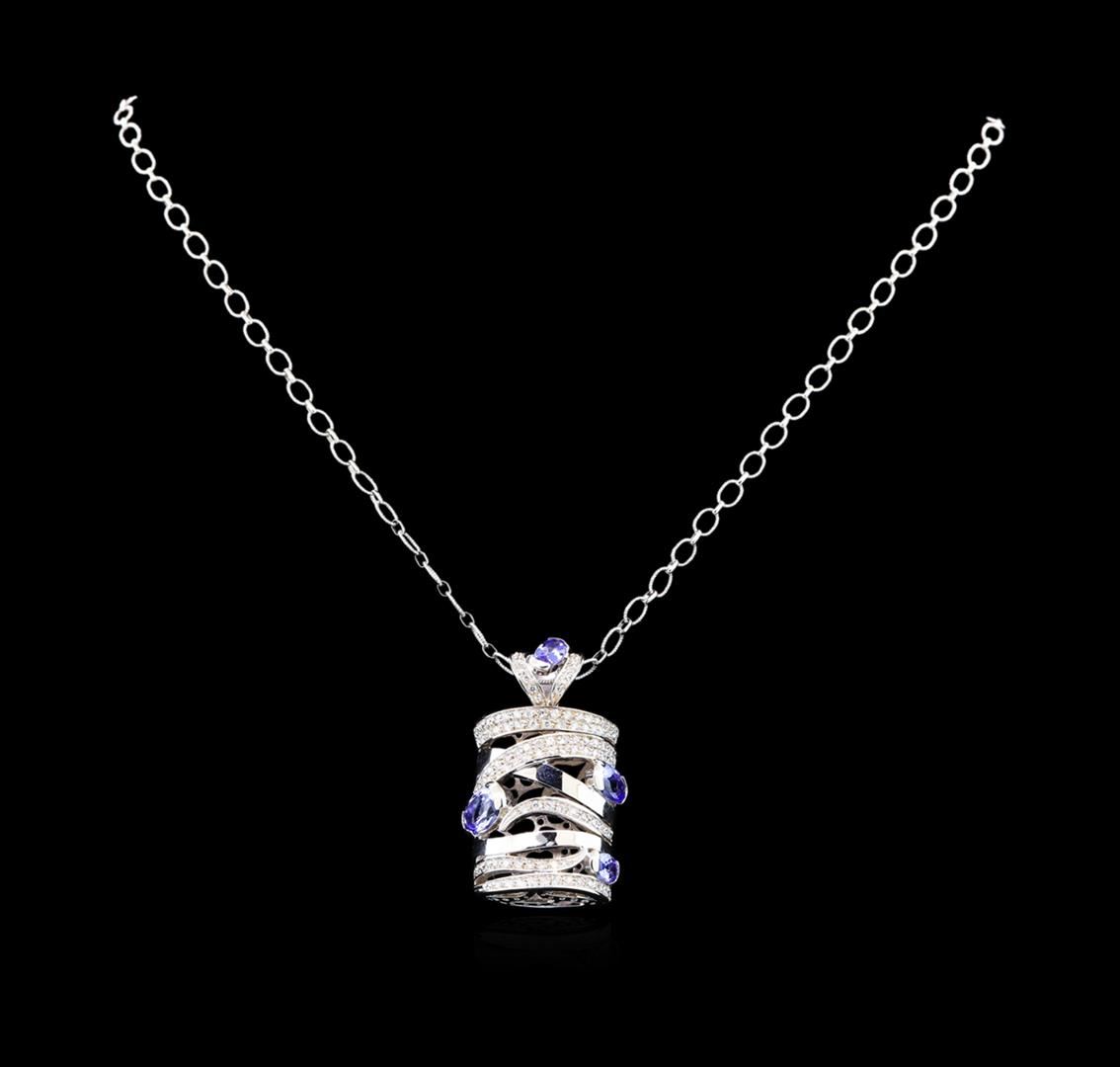 One electronically tested 14KT white gold ladies cast tanzanite and diamond pendant & chain 18.0" long, with a lobster claw clasp with a bright polish finish. Identified with markings of "585". Condition is new. Containing: Two prong set oval modified brilliant cut natural tanzanites, measuring 7.00 x 5.00 x 3.25mm, approximate total weight of 2.54ct., clarity is eye clean, type I, medium light, very slightly grayish, violet color, (GIA V 4/3), cut is good. Two prong set oval modified brilliant cut natural tanzanites, measuring 6.00 x 4.00 x 2.60mm, approximate total weight of 1.06ct., clarity is eye clean, type I, medium light, slightly grayish, violet color, (GIA V 4/2), cut is good. One Hundred Sixteen prong set round brilliant cut diamonds, measuring 1.20 - 1.20 x 0.72mm (depth est.) approximate total weight of 116 Stones = 1.15ct. Clarity: SI-1 to SI-2. Color: H - I, Cut is Good. Colored gemstones are presumed to have been subjected to commonly used enhancement processes. All diamonds and colored gemstones are graded in the mounting, unless otherwise stated. Total Weight of Colored Stones 3.60ct. Total Weight of Diamonds 1.15ct. Total Weight of Pendant & Chain 19.40 grams. GGL Appraised at $7,130.00.