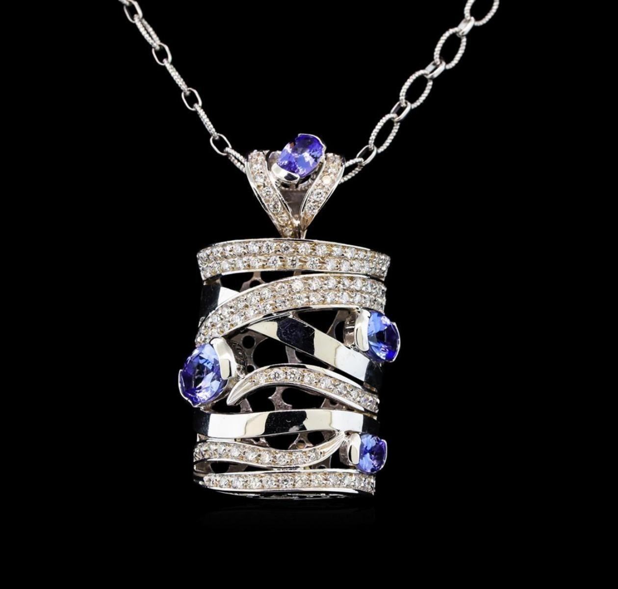 One electronically tested 14KT white gold ladies cast tanzanite and diamond pendant & chain 18.0" long, with a lobster claw clasp with a bright polish finish. Identified with markings of "585". Condition is new. Containing: Two prong set oval modified brilliant cut natural tanzanites, measuring 7.00 x 5.00 x 3.25mm, approximate total weight of 2.54ct., clarity is eye clean, type I, medium light, very slightly grayish, violet color, (GIA V 4/3), cut is good. Two prong set oval modified brilliant cut natural tanzanites, measuring 6.00 x 4.00 x 2.60mm, approximate total weight of 1.06ct., clarity is eye clean, type I, medium light, slightly grayish, violet color, (GIA V 4/2), cut is good. One Hundred Sixteen prong set round brilliant cut diamonds, measuring 1.20 - 1.20 x 0.72mm (depth est.) approximate total weight of 116 Stones = 1.15ct. Clarity: SI-1 to SI-2. Color: H - I, Cut is Good. Colored gemstones are presumed to have been subjected to commonly used enhancement processes. All diamonds and colored gemstones are graded in the mounting, unless otherwise stated. Total Weight of Colored Stones 3.60ct. Total Weight of Diamonds 1.15ct. Total Weight of Pendant & Chain 19.40 grams. GGL Appraised.