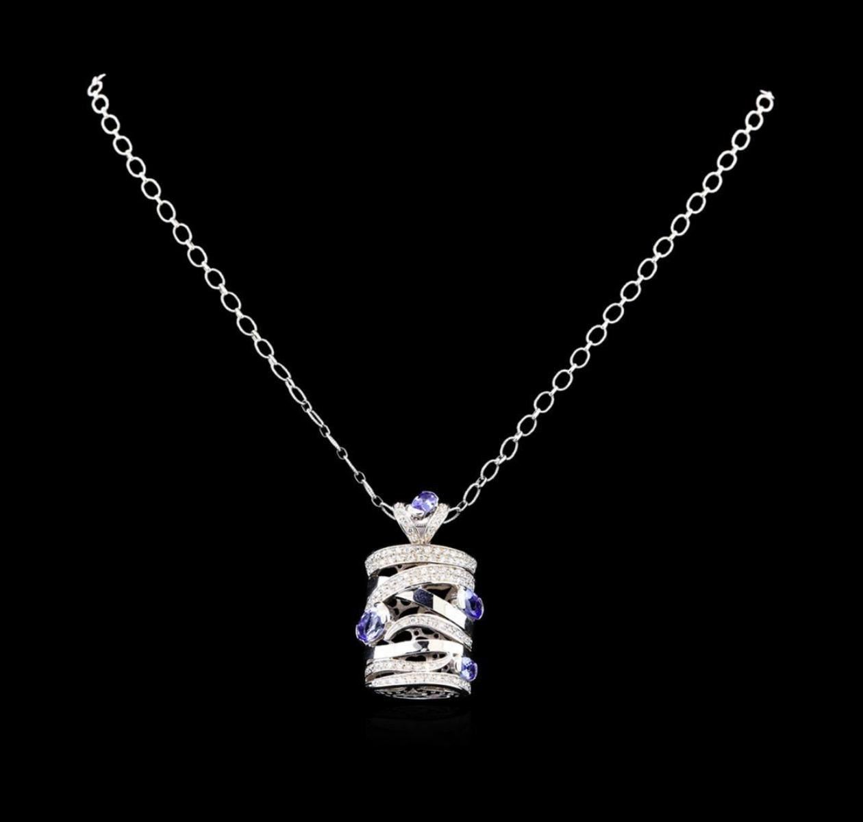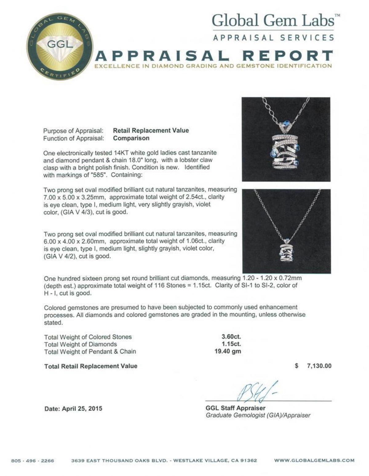 One electronically tested 14KT white gold ladies cast tanzanite and diamond pendant & chain 18.0" long, with a lobster claw clasp with a bright polish finish. Identified with markings of "585". Condition is new. Containing: Two prong set oval modified brilliant cut natural tanzanites, measuring 7.00 x 5.00 x 3.25mm, approximate total weight of 2.54ct., clarity is eye clean, type I, medium light, very slightly grayish, violet color, (GIA V 4/3), cut is good. Two prong set oval modified brilliant cut natural tanzanites, measuring 6.00 x 4.00 x 2.60mm, approximate total weight of 1.06ct., clarity is eye clean, type I, medium light, slightly grayish, violet color, (GIA V 4/2), cut is good. One Hundred Sixteen prong set round brilliant cut diamonds, measuring 1.20 - 1.20 x 0.72mm (depth est.) approximate total weight of 116 Stones = 1.15ct. Clarity: SI-1 to SI-2. Color: H - I, Cut is Good. Colored gemstones are presumed to have been subjected to commonly used enhancement processes. All diamonds and colored gemstones are graded in the mounting, unless otherwise stated. Total Weight of Colored Stones 3.60ct. Total Weight of Diamonds 1.15ct. Total Weight of Pendant & Chain 19.40 grams. GGL Appraised.