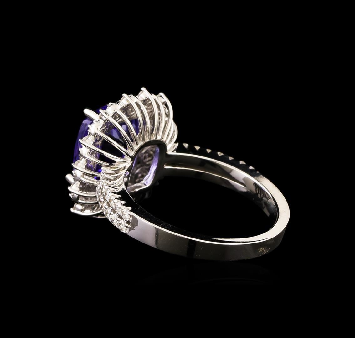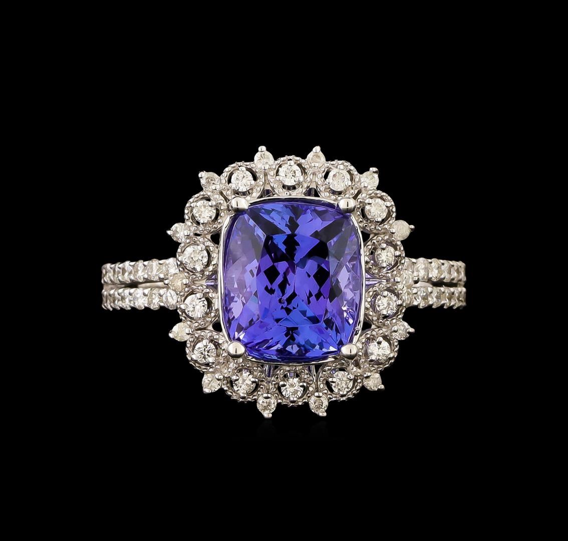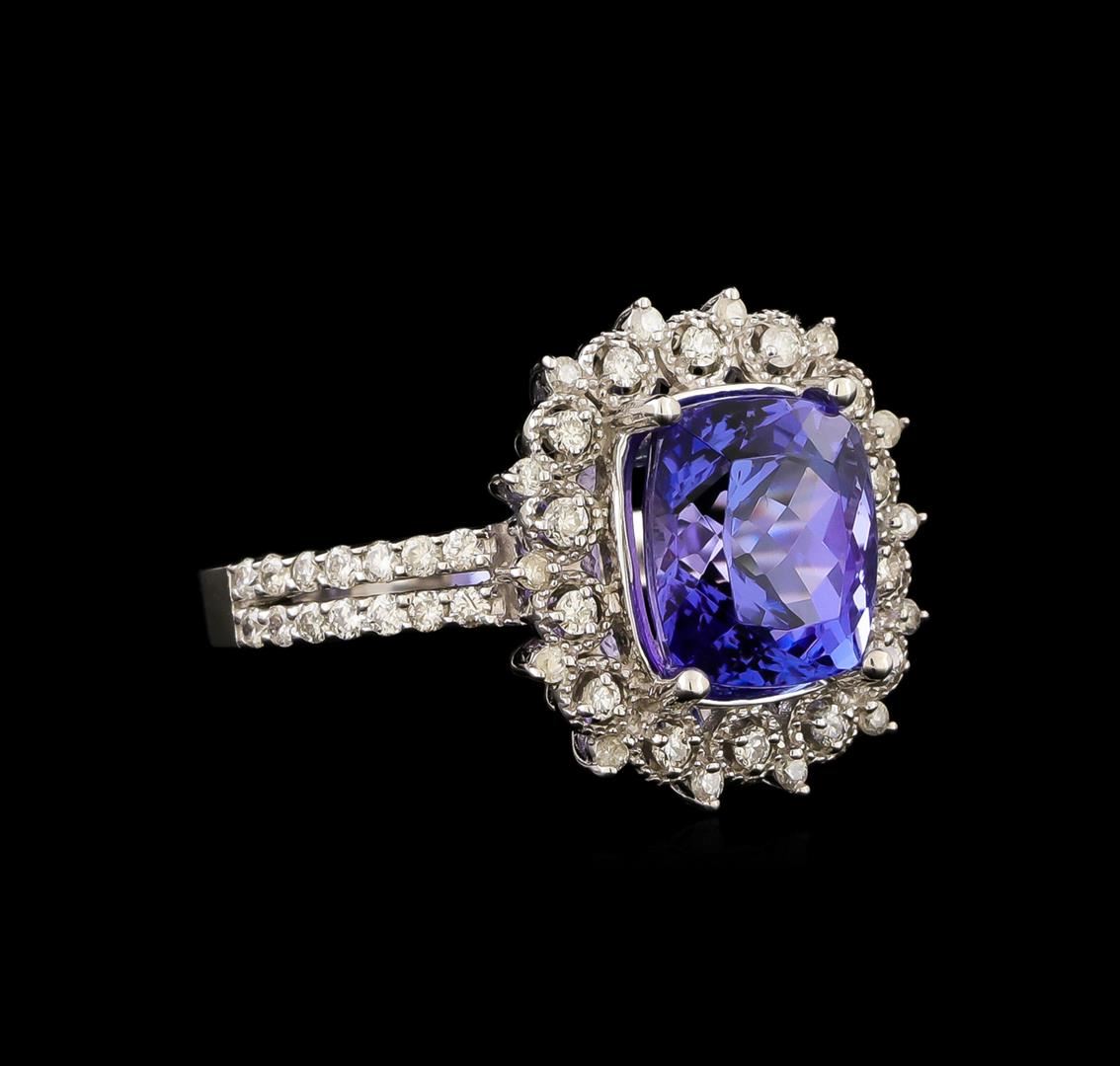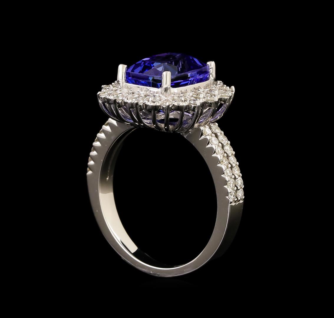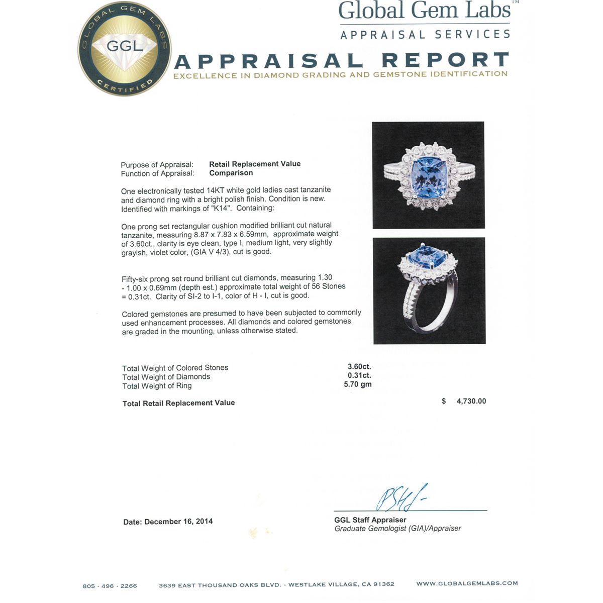 One electronically tested 14KT white gold ladies cast tanzanite and diamond ring with a bright polish finish. Identified with markings of "K14". Condition is new. Containing: One prong set rectangular cushion modified brilliant cut natural tanzanite, measuring 8.87 x 7.83 x 6.59mm, approximate weight of 3.60ct., clarity is eye clean, type I, medium light, very slightly grayish, violet color, (GIA V 4/3), cut is good. Fifty-Six prong set round brilliant cut diamonds, measuring 1.30 - 1.00 x 0.69mm (depth est.) approximate total weight of 56 Stones = 0.31ct. Clarity: SI-2 to I-1. Color: H - I, Cut is Good. Colored gemstones are presumed to have been subjected to commonly used enhancement processes. All diamonds and colored gemstones are graded in the mounting, unless otherwise stated. Total Weight of Colored Stones 3.60ct. Total Weight of Diamonds 0.31ct. Total Weight of Ring 5.70 grams. GGL Appraised at $4,730.00.