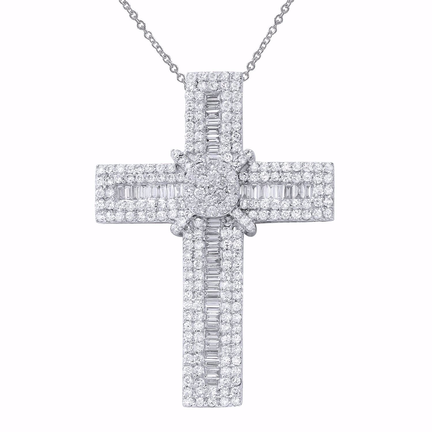 One 14KT White Gold 3.60ctw Diamond Cross Pendant with Chain. (42) Baguette Diamonds with a total weight of 1.14cts. (311) Round Diamonds with a total weight of 2.46cts. Total weight of this pendant with chain is 15.61 grams.