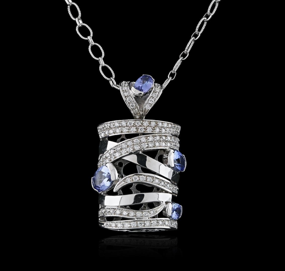 One electronically tested 14KT white gold ladies cast tanzanite and diamond pendant & chain 18.0" long, with a lobster claw clasp with a bright polish finish. Identified with markings of "585". Condition is new. Containing: Two prong set oval modified brilliant cut natural tanzanites, measuring 7.00 x 5.00 x 3.25mm, approximate total weight of 2.54ct., clarity is eye clean, type I, medium light, very slightly grayish, violet color, (GIA V 4/3), cut is good. Two prong set oval modified brilliant cut natural tanzanites, measuring 6.00 x 4.00 x 2.60mm, approximate total weight of 1.06ct., clarity is eye clean, type I, medium light, slightly grayish, violet color, (GIA V 4/2), cut is good. One Hundred Sixteen prong set round brilliant cut diamonds, measuring 1.20 - 1.20 x 0.72mm (depth est.) approximate total weight of 116 Stones = 1.15ct. Clarity: SI-1 to SI-2. Color: H - I, Cut is Good. Colored gemstones are presumed to have been subjected to commonly used enhancement processes. All diamonds and colored gemstones are graded in the mounting, unless otherwise stated. Total Weight of Colored Stones 3.60ct. Total Weight of Diamonds 1.15ct. Total Weight of Pendant & Chain 19.40 grams. GGL Appraised at $7,130.00.