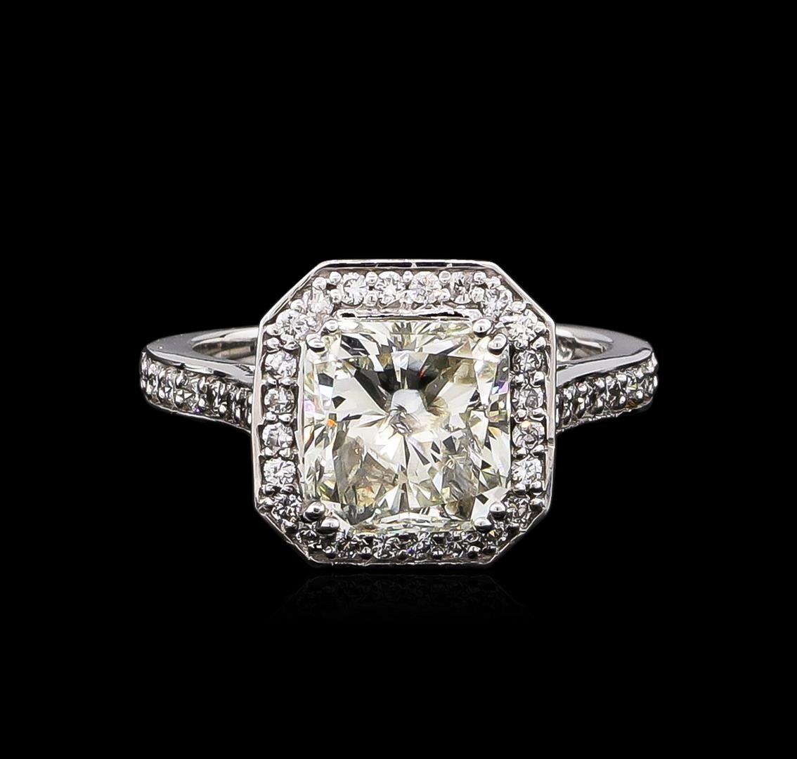 One electronically tested 14KT white gold ladies cast diamond unity ring with a bright polish finish. Condition is new, good workmanship. The featured diamond is set within a diamond lattice gallery, supported by diamond set shoulders and completed by a two millimeter wide band. Identified with markings of "14K". Containing: One prong set radiant shaped cut diamond, measuring 8.50 x 8.25 x 6.19mm (depth est.) approximate weight of 3.62ct with a strong fluorescence. Diamond Grading Report attached. Graded in the setting. Clarity I-1. Color. Depth 75.0%. Table 77.6%. Forty prong set round brilliant cut diamonds, measuring 1.50 - 1.30 x 0.84mm (depth est.) approximate total weight of 40 Stones = 0.49ct. Graded in the setting. Clarity I-1 to 1-2. Color H -- I. Total Weight of Diamonds 4.11ct. Total Weight of Ring 5.00gm. AIG Appraised at $34,250.00.