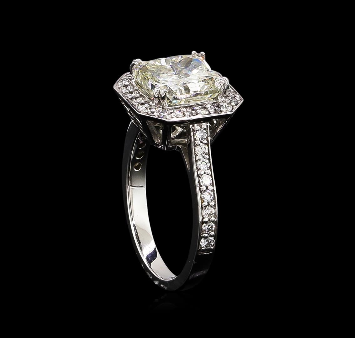 One electronically tested 14KT white gold ladies cast diamond unity ring with a bright polish finish. Condition is new, good workmanship. The featured diamond is set within a diamond lattice gallery, supported by diamond set shoulders and completed by a two millimeter wide band. Identified with markings of "14K". Containing: One prong set radiant shaped cut diamond, measuring 8.50 x 8.25 x 6.19mm (depth est.) approximate weight of 3.62ct with a strong fluorescence. Diamond Grading Report attached. Graded in the setting. Clarity I-1. Color. Depth 75.0%. Table 77.6%. Forty prong set round brilliant cut diamonds, measuring 1.50 - 1.30 x 0.84mm (depth est.) approximate total weight of 40 Stones = 0.49ct. Graded in the setting. Clarity I-1 to 1-2. Color H -- I. Total Weight of Diamonds 4.11ct. Total Weight of Ring 5.00gm. AIG Appraised at $34,250.00.