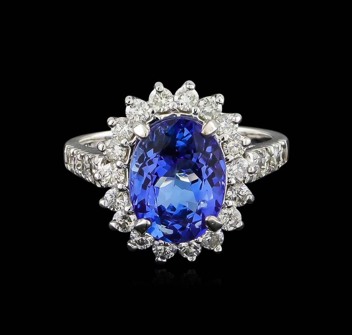 One electronically tested 14KT white gold ladies combination cast & assembled ring with a bright polish finish. Identified with markings of "14K". Condition is new. Containing: One prong set oval modified brilliant cut natural tanzanite, measuring 10.87 x 8.40 x 5.84mm, approximate weight of 3.63ct., clarity is eye clean, type I, medium light, very slightly grayish, violet color, (GIA V 4/3), cut is good. Twenty-Six prong set round brilliant cut diamonds, measuring 2.00 - 2.00 x 1.20mm (depth est.) approximate total weight of 26 Stones = 0.76ct. Clarity: SI-2 to I-1. Color: I - J, Cut is Good. Colored gemstones are presumed to have been subjected to commonly used enhancement processes. All diamonds and colored gemstones are graded in the mounting, unless otherwise stated. Total Weight of Colored Stones 3.63ct. Total Weight of Diamonds 0.76ct. Total Weight of Ring 5.20 grams. GGL Appraised at $8,340.00.