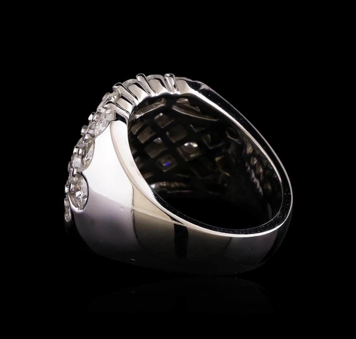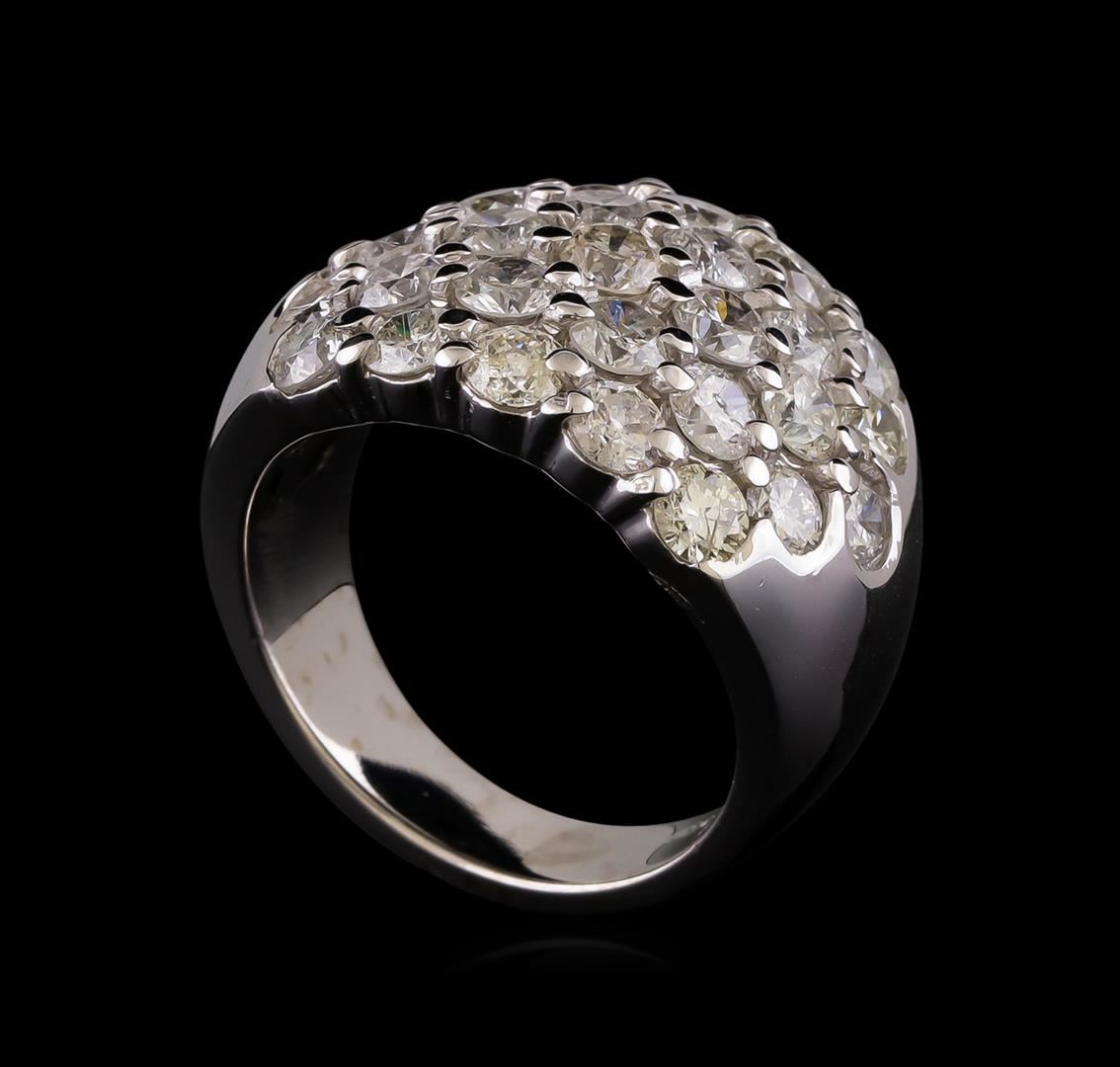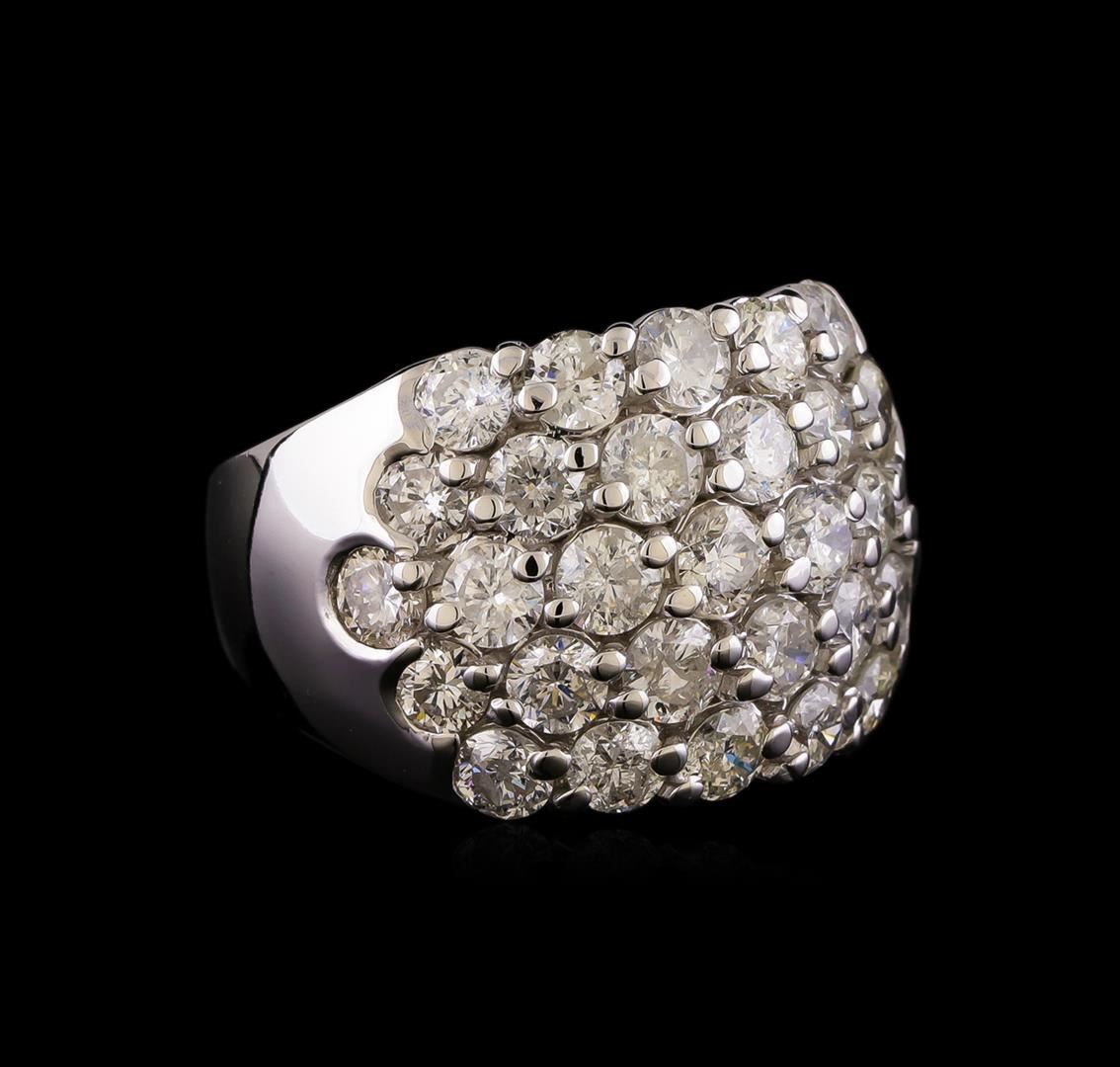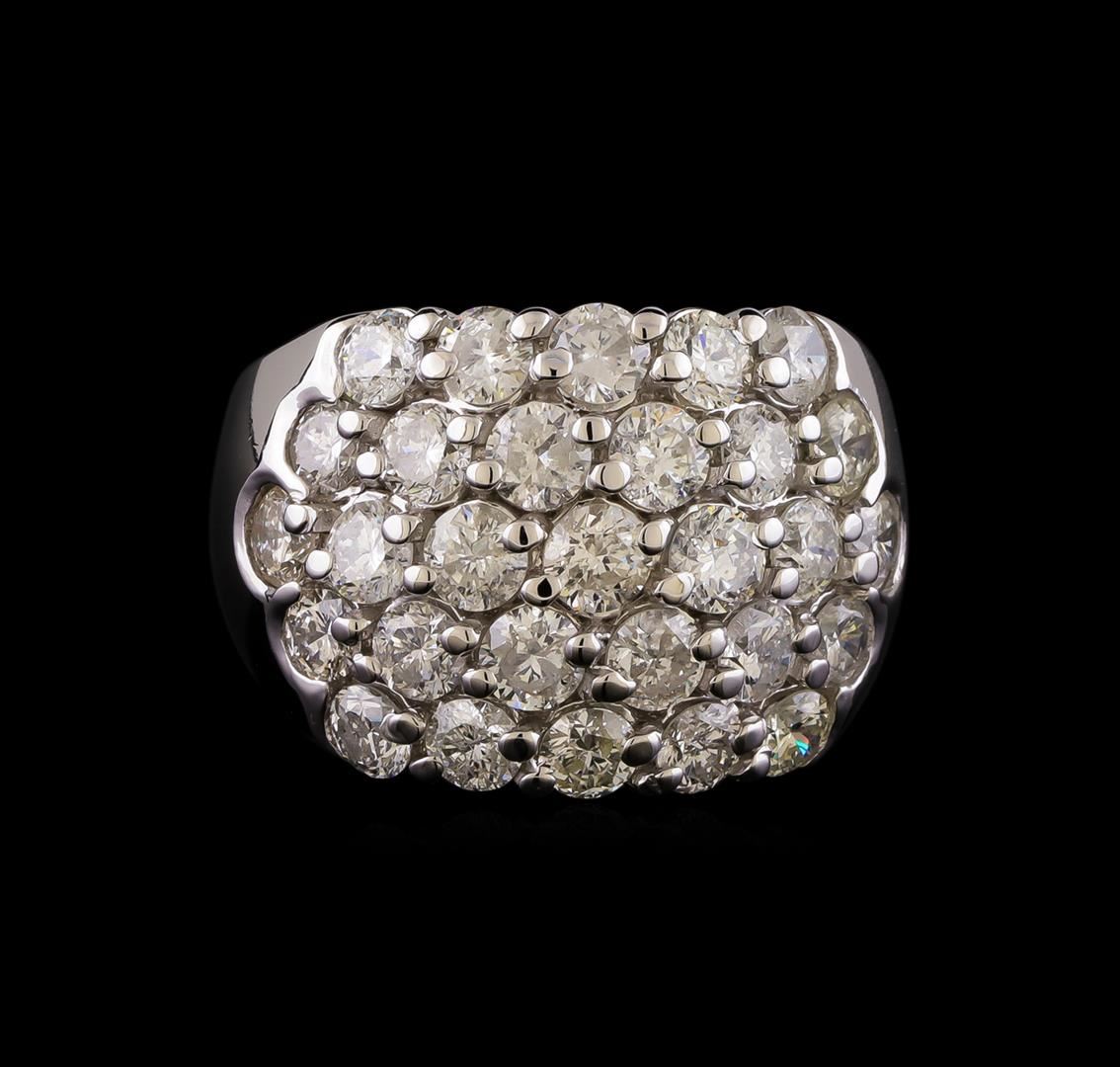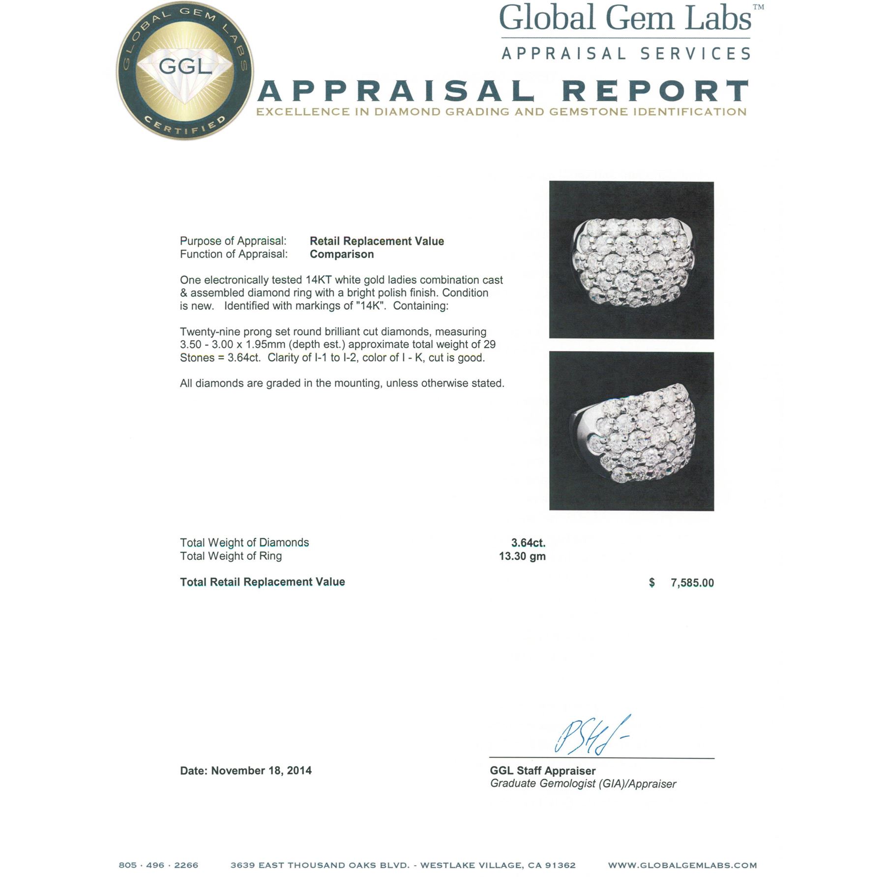 One electronically tested 14KT white gold ladies combination cast & assembled diamond ring with a bright polish finish. Identified with markings of "14K". Condition is new. Containing: Twenty-Nine prong set round brilliant cut diamonds, measuring 3.50 - 3.00 x 1.95mm (depth est.) approximate total weight of 29 Stones = 3.64ct. Clarity: I-1 to I-2. Color: I - K, Cut is Good. All diamonds are graded in the mounting, unless otherwise stated. Total Weight of Diamonds 3.64ct. Total Weight of Ring 13.30 grams. GGL Appraised at $7,585.00.
