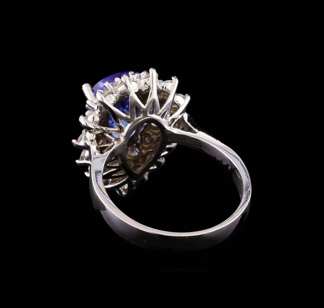One electronically tested 14KT white gold ladies combination cast & assembled tanzanite and diamond ring with a flat shank with a bright polish finish. Identified with markings of "K14". Condition is new. Containing: One prong set pear modified brilliant cut natural tanzanite, measuring 12.00 x 8.01 x 5.66mm, approximate weight of 3.65ct., clarity is eye clean, type I, medium, very slightly grayish, violet color, (GIA V 5/3), cut is good. Twenty-Nine prong set round brilliant cut diamonds, measuring 2.50 - 2.00 x 1.35mm (depth est.) approximate total weight of 29 Stones = 1.21ct. Clarity: SI-1 to I-1. Color: J, Cut is Good. Colored gemstones are presumed to have been subjected to commonly used enhancement processes. All diamonds and colored gemstones are graded in the mounting, unless otherwise stated. Total Weight of Colored Stones 3.65ct. Total Weight of Diamonds 1.21ct. Total Weight of Ring 6.10 grams. GGL Appraised at $9,495.00.