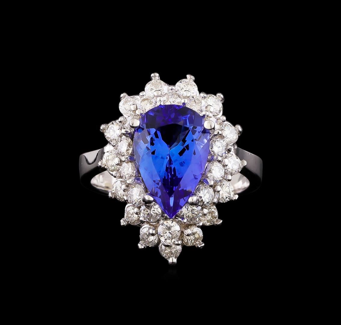 One electronically tested 14KT white gold ladies combination cast & assembled tanzanite and diamond ring with a flat shank with a bright polish finish. Identified with markings of "K14". Condition is new. Containing: One prong set pear modified brilliant cut natural tanzanite, measuring 12.00 x 8.01 x 5.66mm, approximate weight of 3.65ct., clarity is eye clean, type I, medium, very slightly grayish, violet color, (GIA V 5/3), cut is good. Twenty-Nine prong set round brilliant cut diamonds, measuring 2.50 - 2.00 x 1.35mm (depth est.) approximate total weight of 29 Stones = 1.21ct. Clarity: SI-1 to I-1. Color: J, Cut is Good. Colored gemstones are presumed to have been subjected to commonly used enhancement processes. All diamonds and colored gemstones are graded in the mounting, unless otherwise stated. Total Weight of Colored Stones 3.65ct. Total Weight of Diamonds 1.21ct. Total Weight of Ring 6.10 grams. GGL Appraised at $9,495.00.