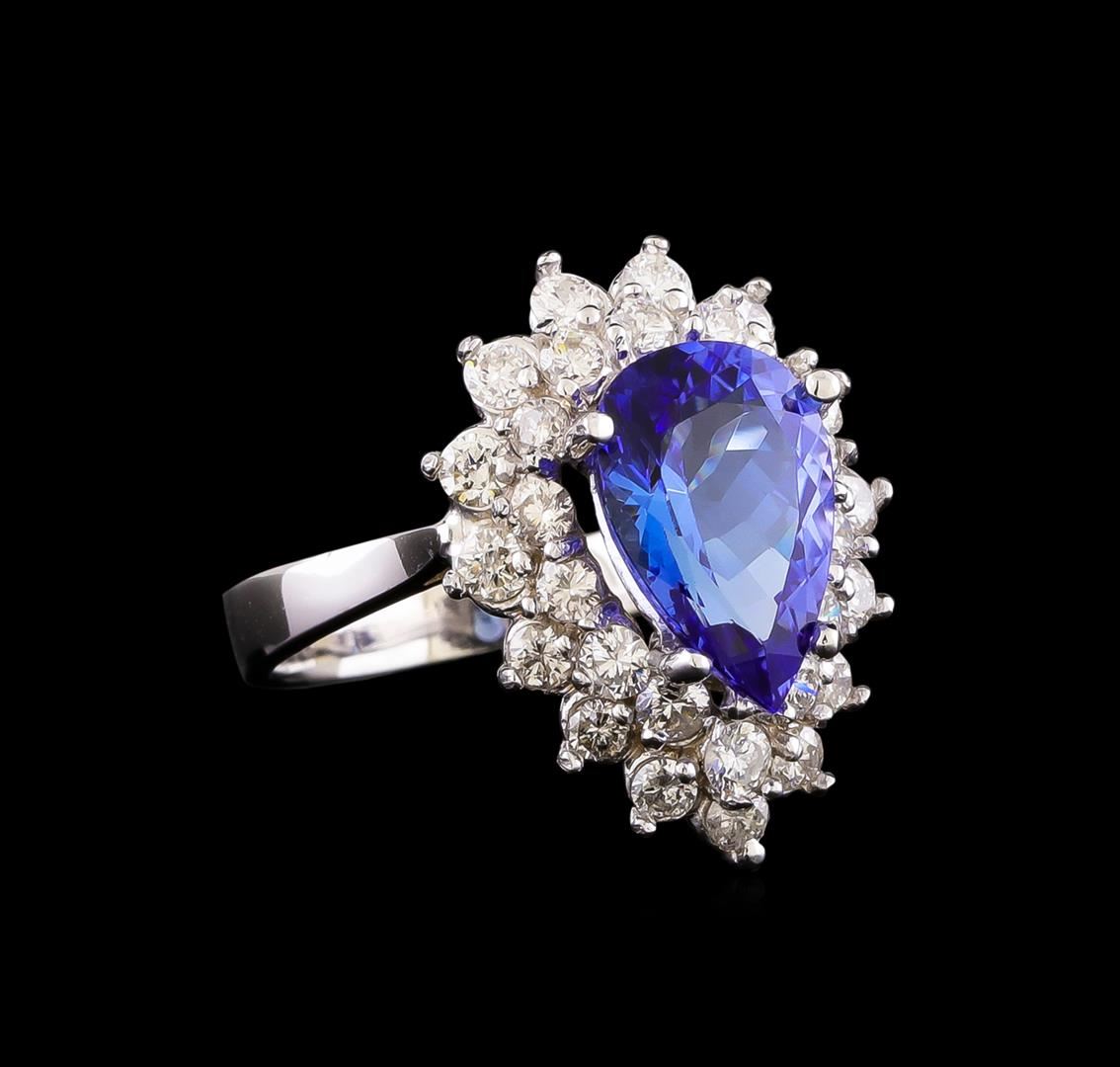 One electronically tested 14KT white gold ladies combination cast & assembled tanzanite and diamond ring with a flat shank with a bright polish finish. Identified with markings of "K14". Condition is new. Containing: One prong set pear modified brilliant cut natural tanzanite, measuring 12.00 x 8.01 x 5.66mm, approximate weight of 3.65ct., clarity is eye clean, type I, medium, very slightly grayish, violet color, (GIA V 5/3), cut is good. Twenty-Nine prong set round brilliant cut diamonds, measuring 2.50 - 2.00 x 1.35mm (depth est.) approximate total weight of 29 Stones = 1.21ct. Clarity: SI-1 to I-1. Color: J, Cut is Good. Colored gemstones are presumed to have been subjected to commonly used enhancement processes. All diamonds and colored gemstones are graded in the mounting, unless otherwise stated. Total Weight of Colored Stones 3.65ct. Total Weight of Diamonds 1.21ct. Total Weight of Ring 6.10 grams. GGL Appraised at $9,495.00.