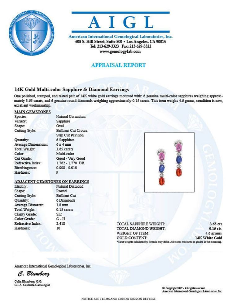 One 14KT White Gold 3.65ctw Multi Color Sapphire and Diamond Earrings. (6) Multi Color Sapphires with a total weight of 3.65cts. (6) Diamonds with a total weight of 0.15cts. Total weight of these earrings are 4.6 grams.