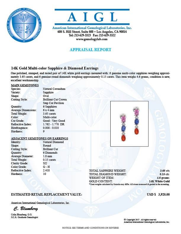 One 14KT White Gold 3.65ctw Multi Color Sapphire and Diamond Earrings. (6) Multi Color Sapphires with a total weight of 3.65cts. (6) Diamonds with a total weight of 0.15cts. Total weight of these earrings are 4.6 grams.