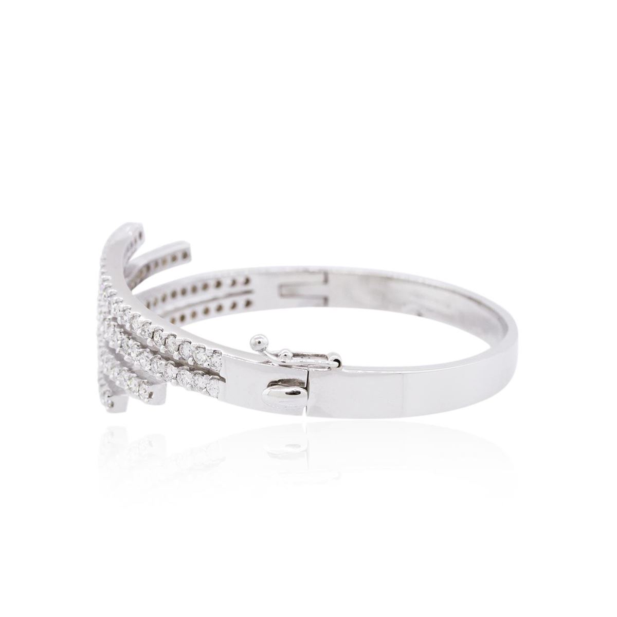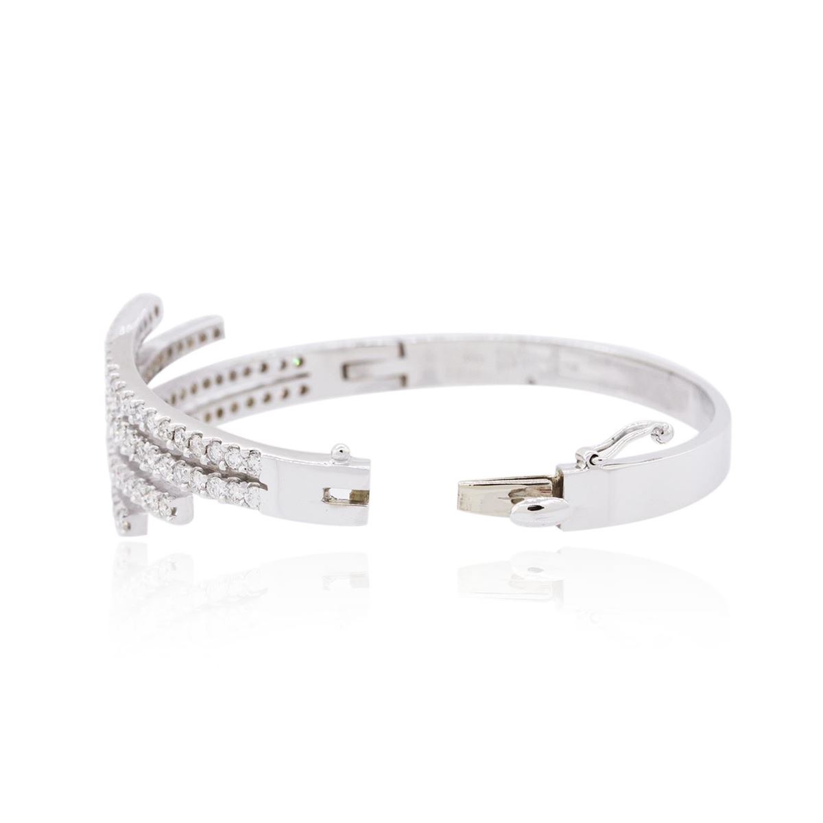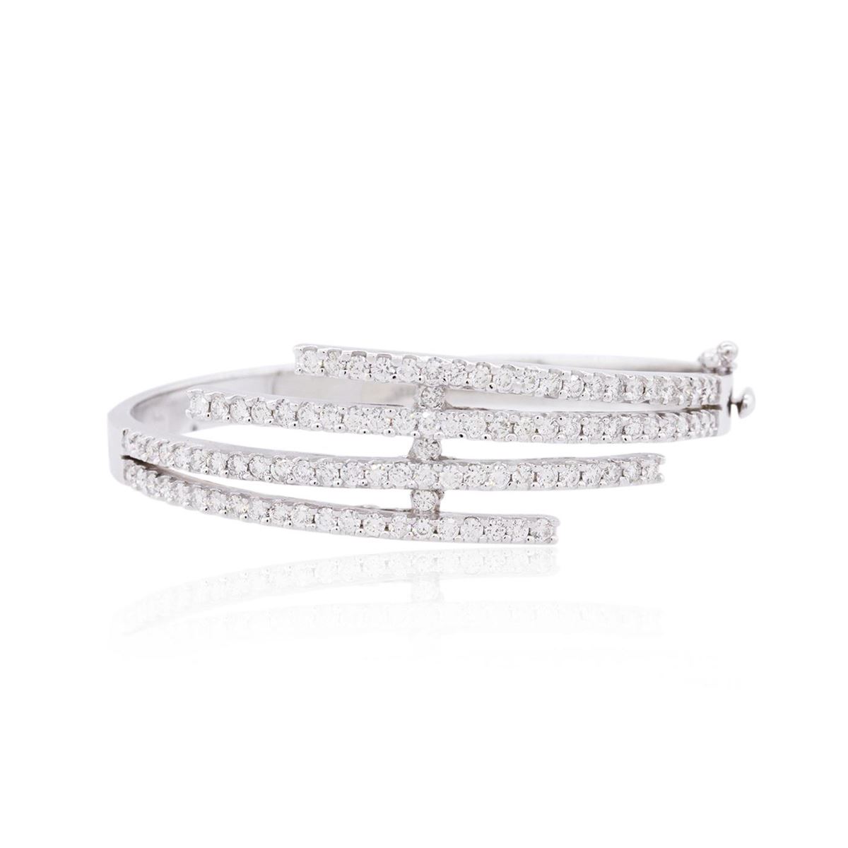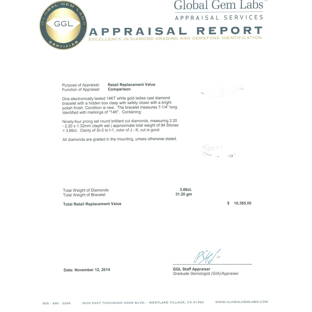 One electronically tested 14KT white gold ladies cast diamond bracelet with a hidden box clasp with safety closer with a bright polish finish. The bracelet measures 7-1/4" long. Identified with markings of "14K". Condition is new. Containing: Ninety-Four prong set round brilliant cut diamonds, measuring 2.20 - 2.20 x 1.32mm (depth est.) approximate total weight of 94 Stones = 3.66ct. Clarity: SI-2 to I-1. Color: J - K, Cut is Good. All diamonds are graded in the mounting, unless otherwise stated. Total Weight of Diamonds 3.66ct. Total Weight of Bracelet 31.20 grams. GGL Appraised at $16,385.00.