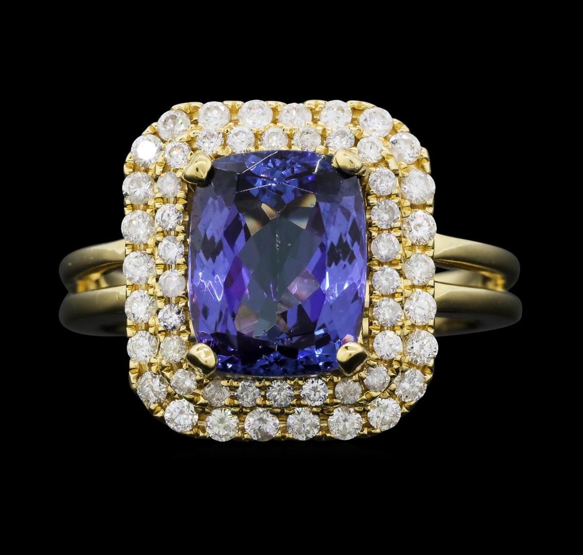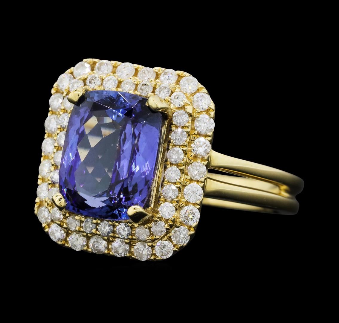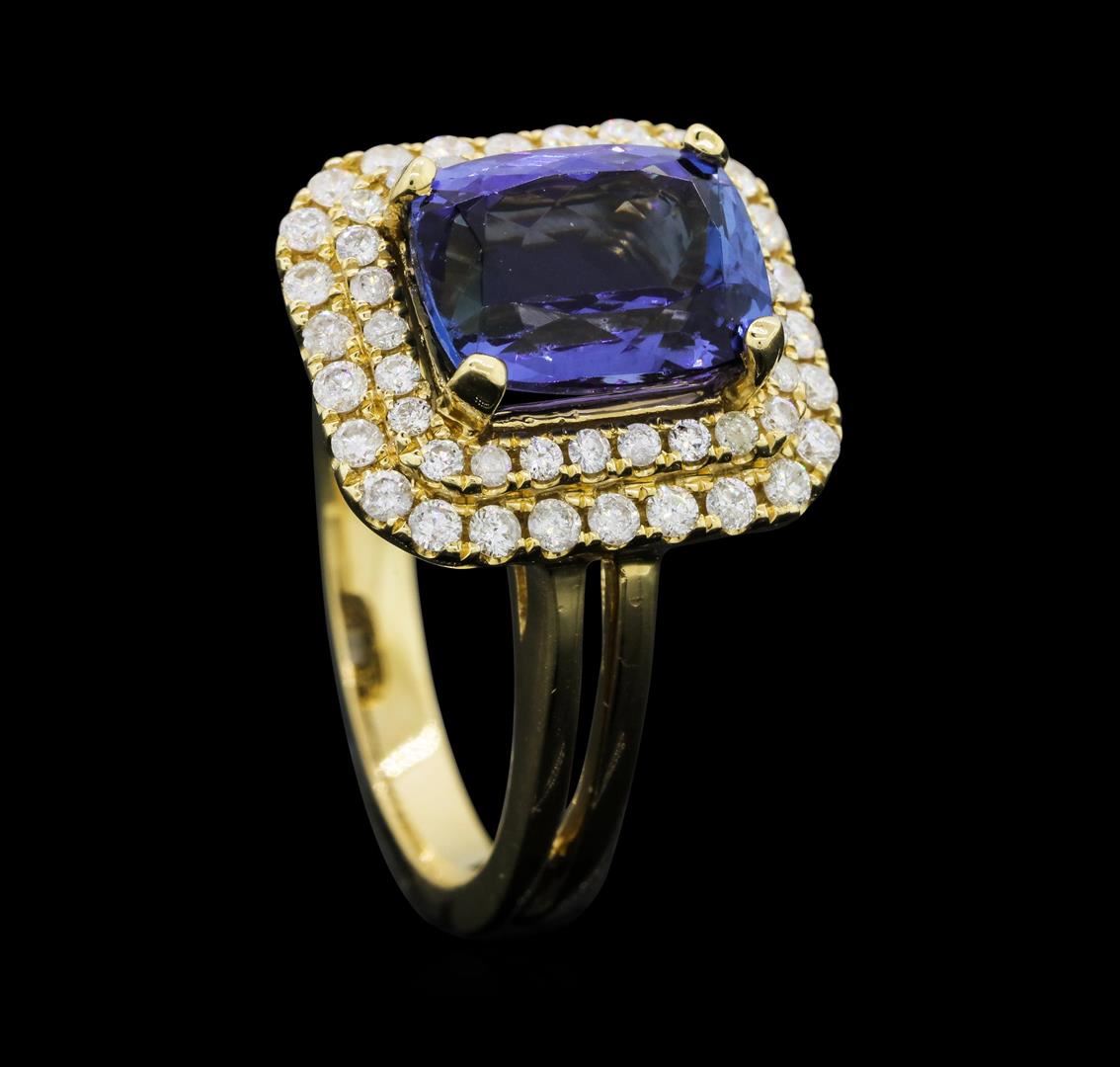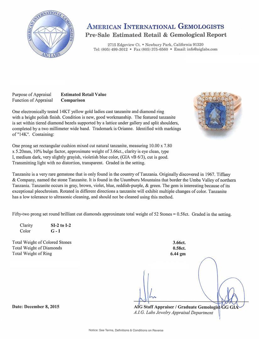 One electronically tested 14KT yellow gold ladies cast tanzanite and diamond ring with a bright polish finish. The featured tanzanite is set within tiered diamond bezels supported by a lattice under gallery and split shoulders, completed by a two millimeter wide band. Trademark is Orianne. Identified with markings of "14K". Condition is new, good workmanship. Containing: One prong set rectangular cushion mixed cut natural tanzanite, measuring 10.00 x 7.80 x 5.20mm, 10%. bulge factor, approximate weight of 3.66ct., clarity is eye clean, type I, medium dark, very slightly grayish, violetish blue color, (GIA vB 6/3), cut is good. Transmitting light with no distortion, transparent. Graded in the setting. Tanzanite is a very rare gemstone that is only found in the country of Tanzania. Originally discovered in 1967. Tiffany & Company, named the stone Tanzanite. It is found in the Usumburu Mountains that border the Umba Valley of northern Tanzania. Tanzanite occurs in gray, brown, violet, blue, reddish-purple, & green. The gem is interesting because of its exceptional pleochroism. Rotated in different directions a tanzanite will exhibit multiple changes of color. Tanzanite has a low tolerance to ultrasonic cleaning, and should not be cleaned using this method. Fifty-Two prong set round brilliant cut diamonds approximate total weight of 52 Stones = 0.58ct. Graded in the setting. Clarity: SI-2 to I-2. Color: G - I. Total Weight of Colored Stones 3.66ct. Total Weight of Diamonds 0.58ct. Total Weight of Ring 6.44gm. AIG Appraised.